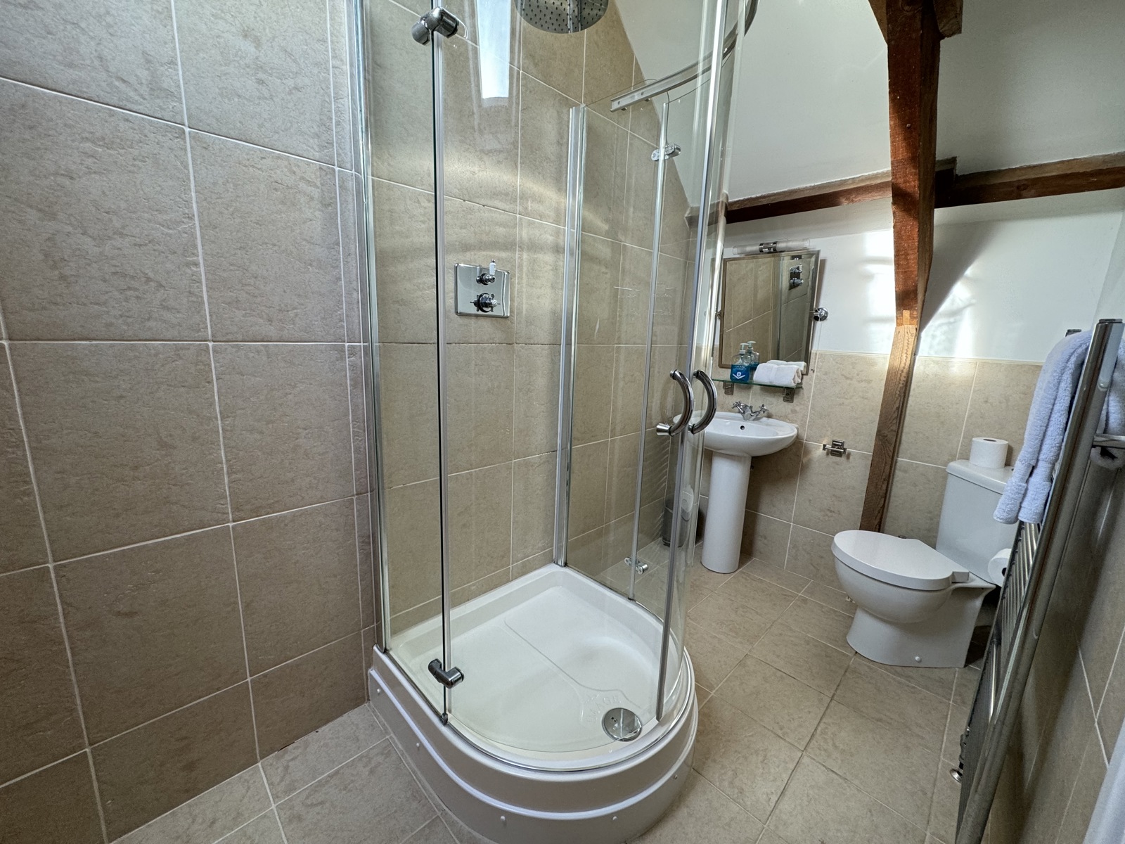 Tiled floor, half tiled walls, heated towel rail, shower, WC, wash hand basin, storage cupboard, Velux window.