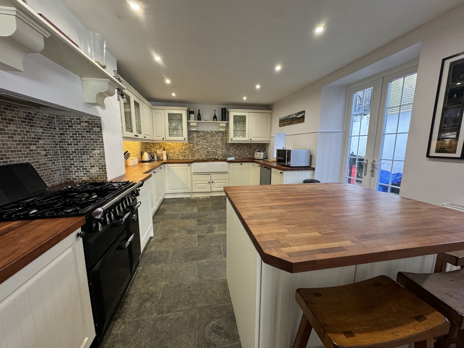 Stone floor, range of base and eye level units, integrated fridge, freezer, dishwasher, washing machine and wine cooler, double sink, rangemaster, radiator, 2x double glazed uPVC windows plus door.