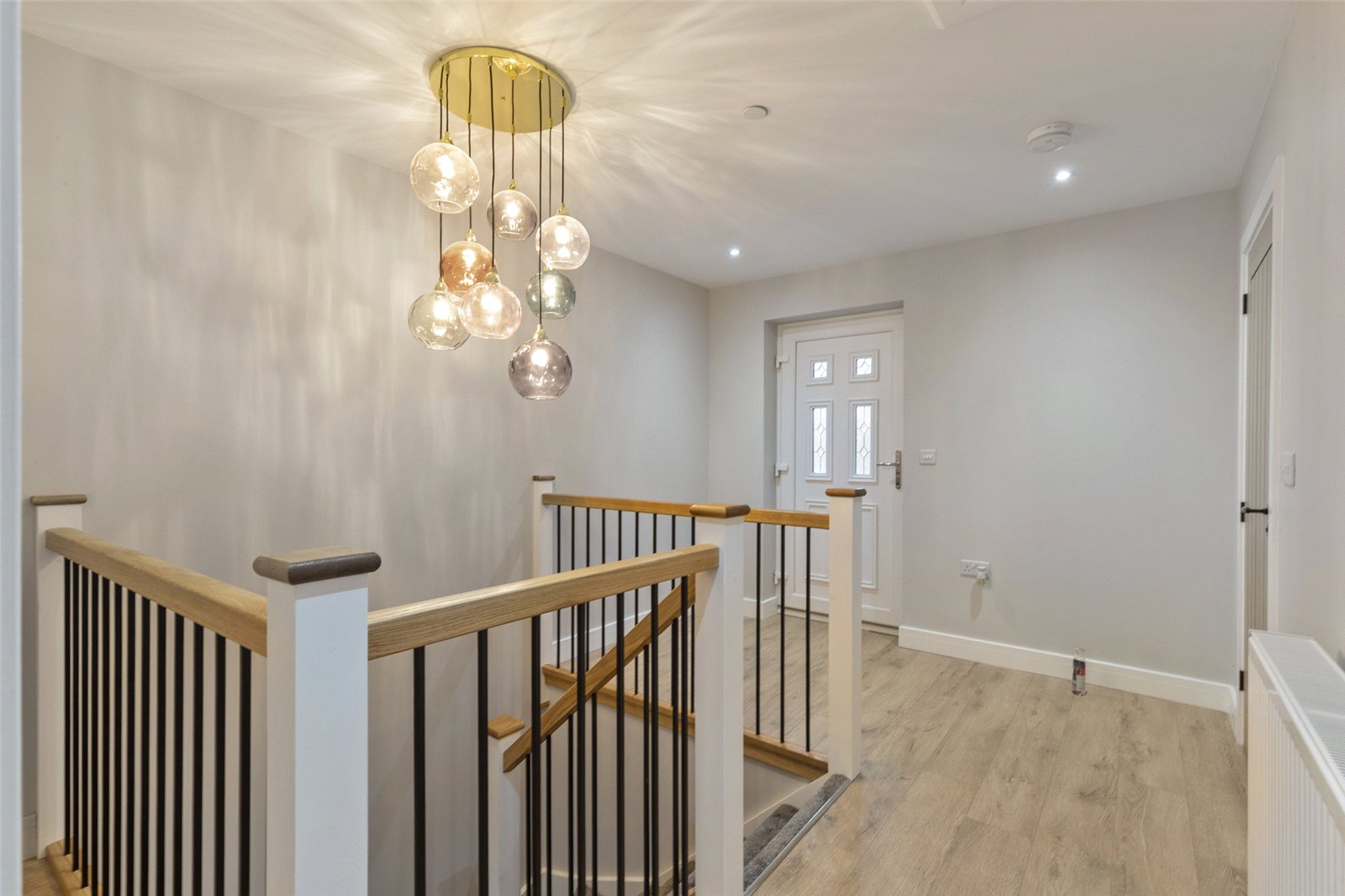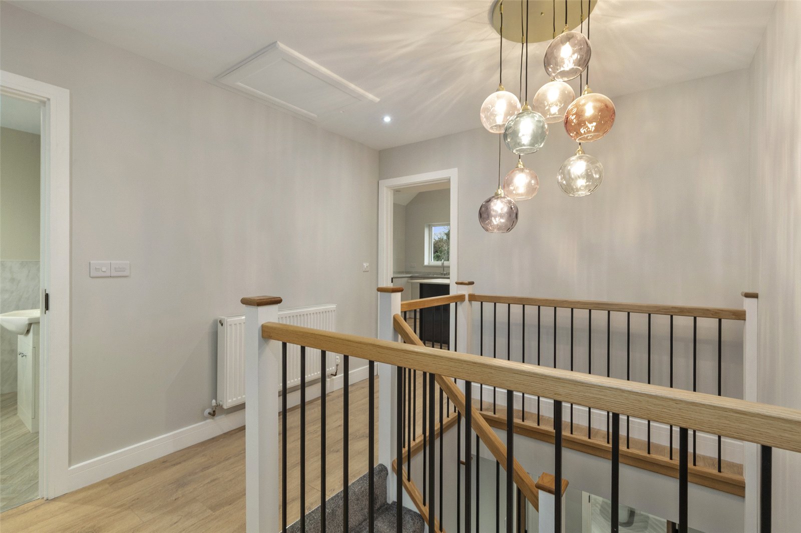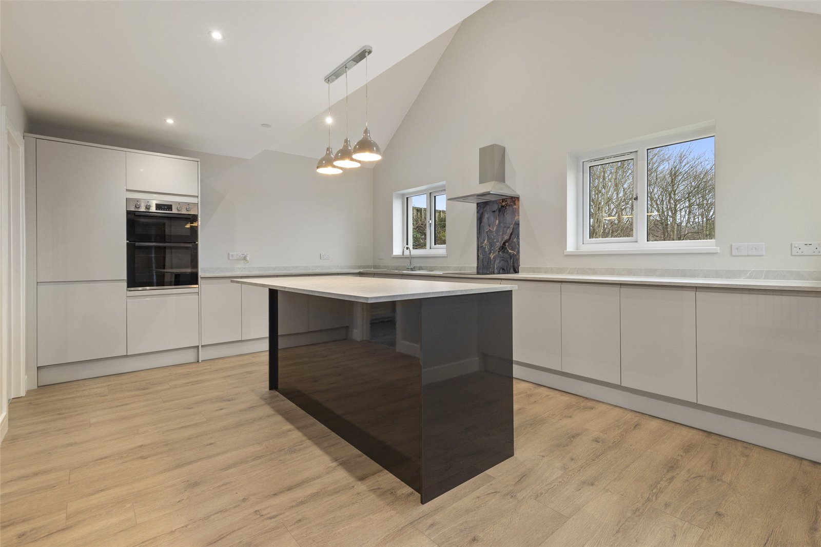 Designed in an upside-down living style to maximise the outlook, the first floor features a beautiful gallery landing leading to a modern and contemporary kitchen with integrated appliances, a large central island, and dual-aspect windows. A door leads to a utility room with side access, housing the boiler and providing additional storage.