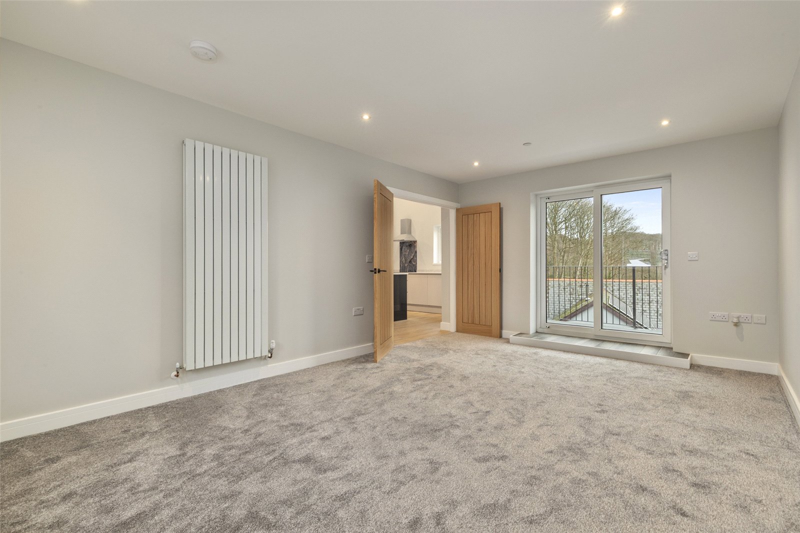 Double doors open into a spacious lounge overlooking the front, with French doors leading onto a balcony enjoying impressive water views. There is also a convenient upstairs WC.