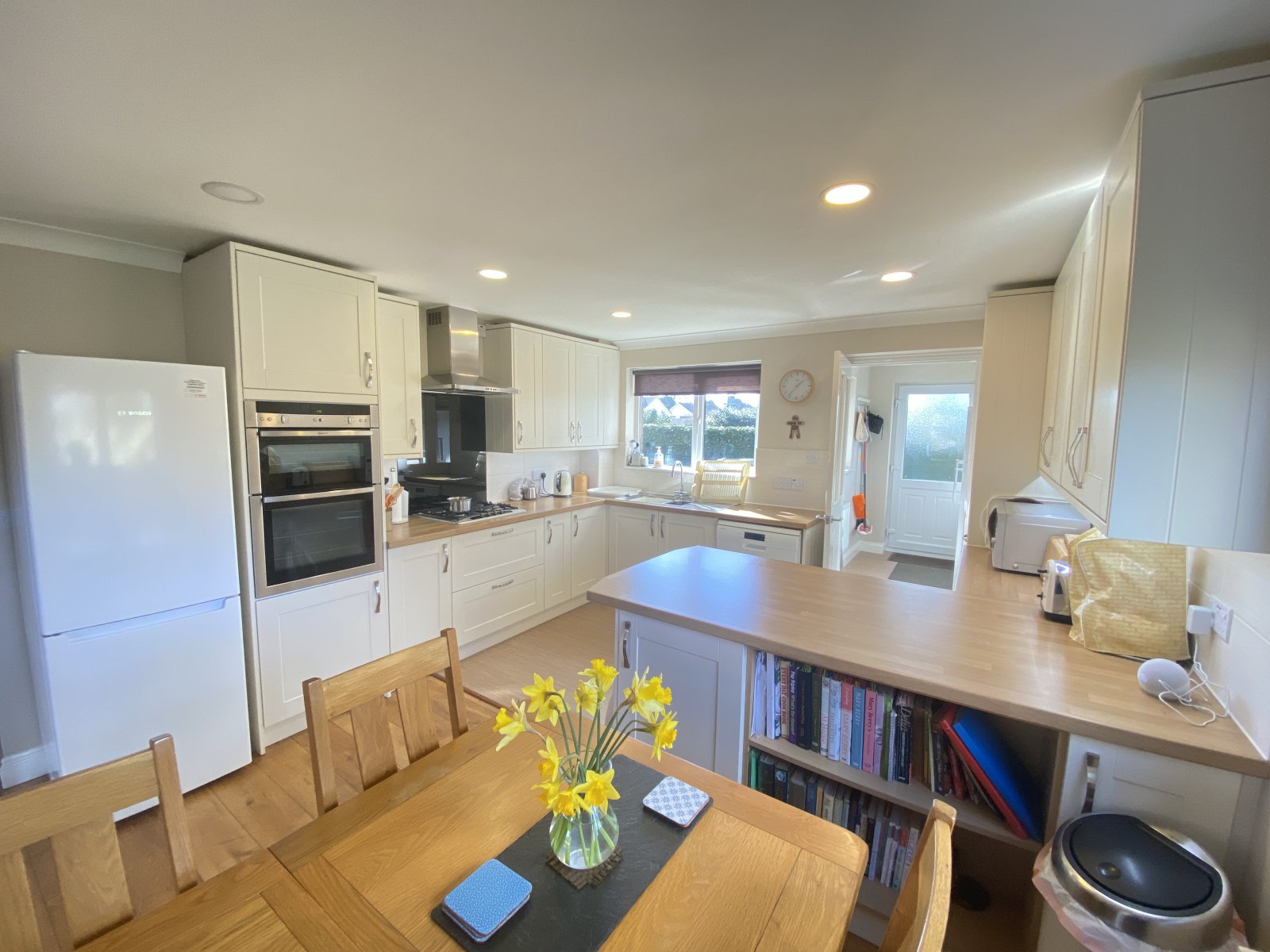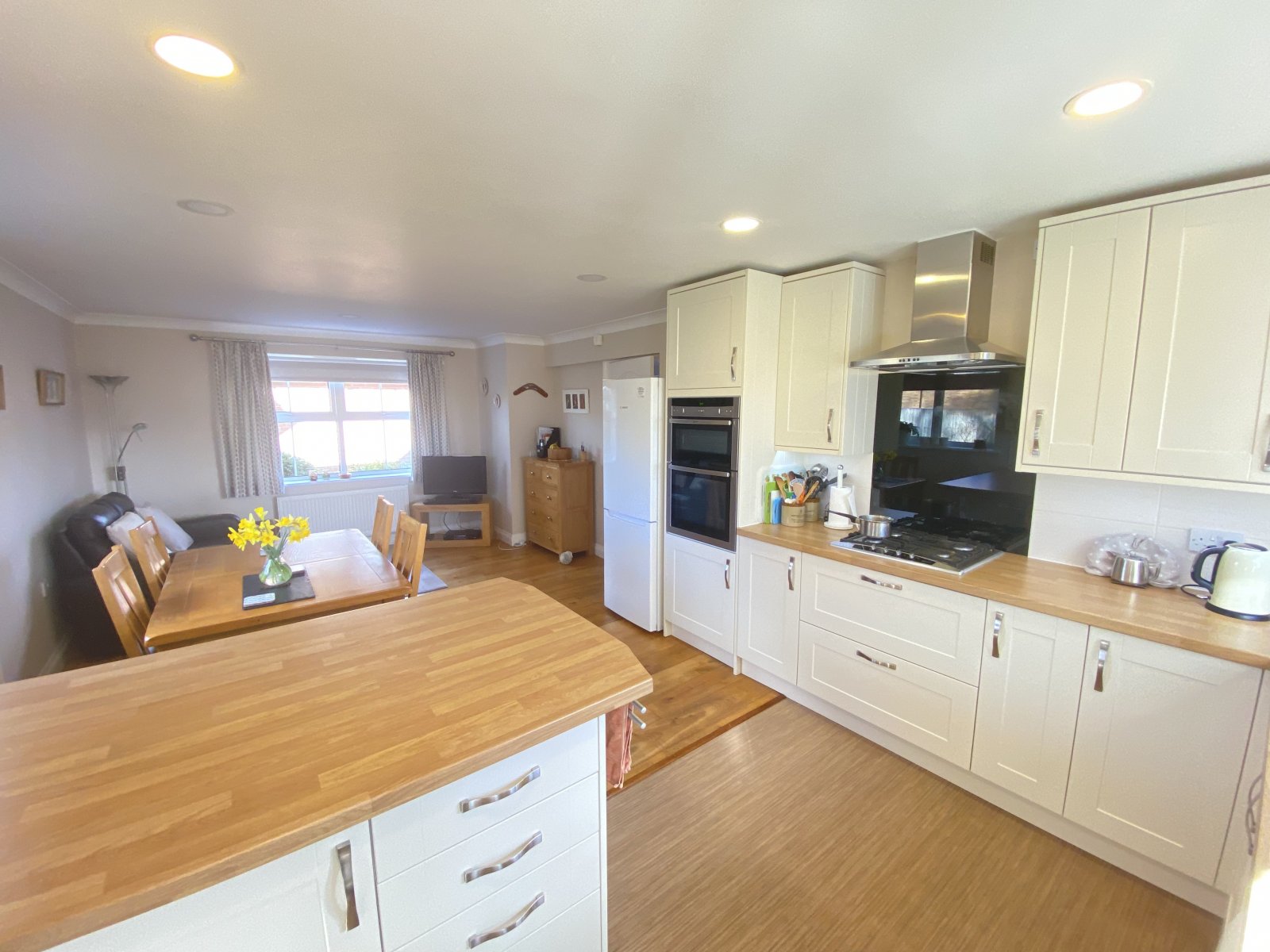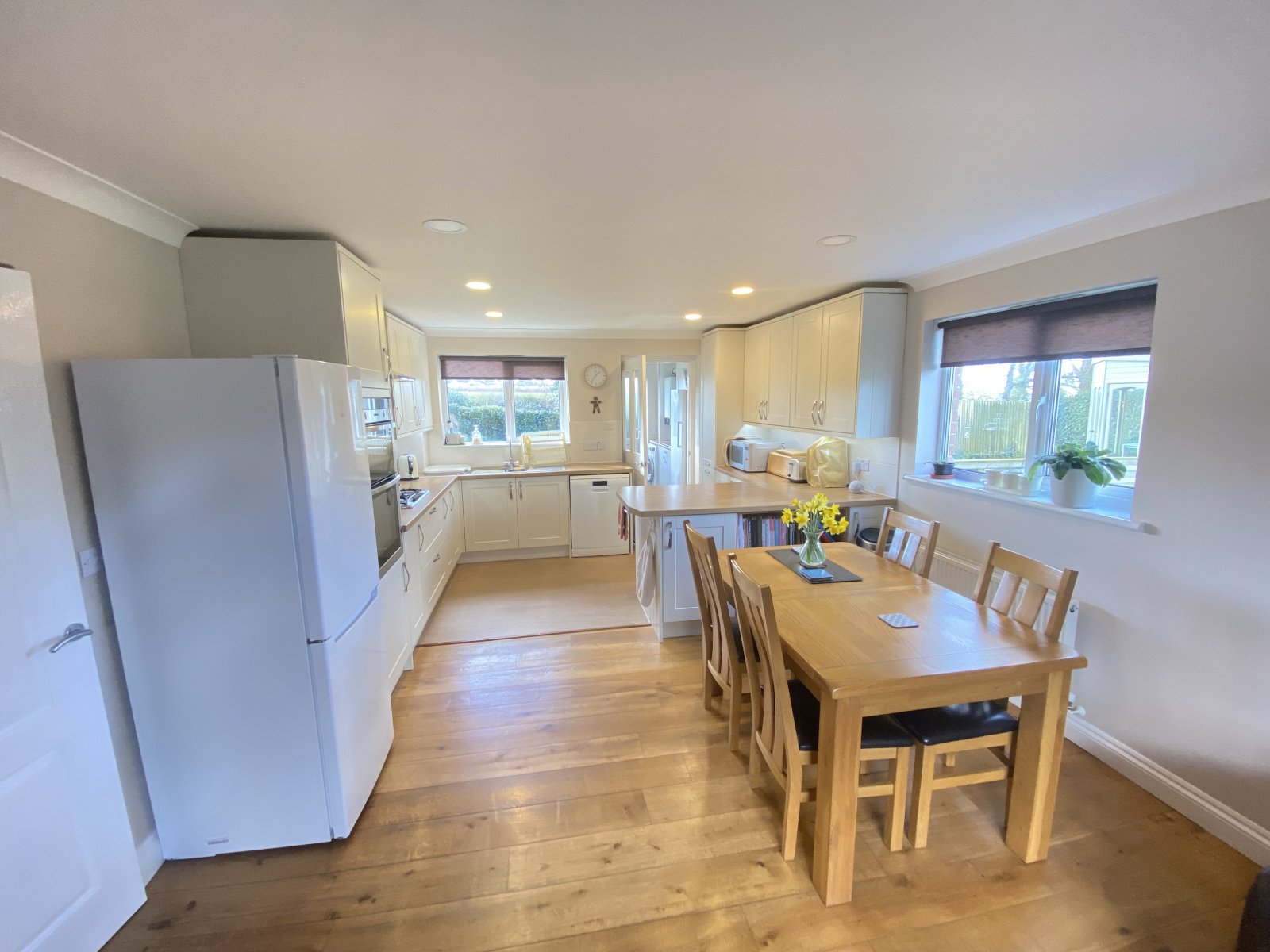 Combination of oak and cushion flooring, 3 uPVC windows to fore, side and rear, ceiling downlighters, cream fitted units with wood effect work tops, 1 &1/2 sink, built-in cooker and hob, T.V. point, tiled surround, extractor fan.
