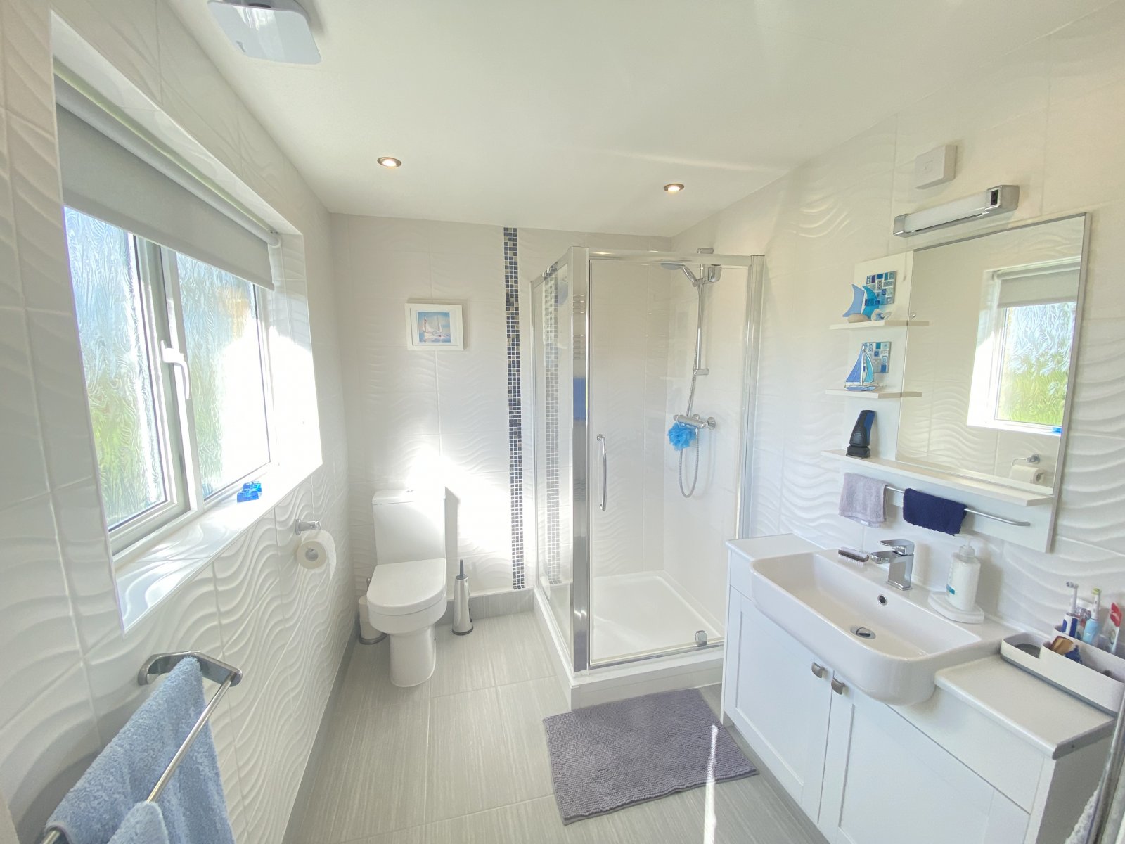 Tiled walls & flooring, ceiling spotlights, 3 piece suite comprising wc, pedestal wash hand basin, walk in shower with tiled surround, extractor fan, frosted uPVC window to rear, heated towel rail.