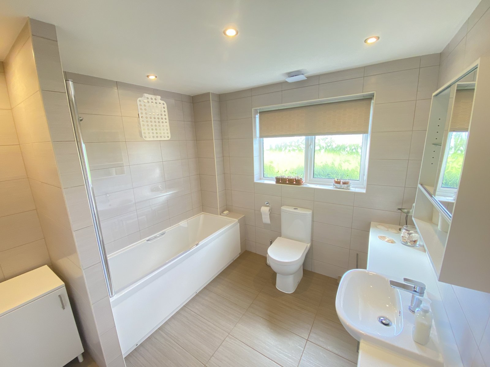 Tiled flooring & walls, ceiling spotlights, 3-piece suite comprising wc, pedestal wash hand basin, heated towel rail, bath with shower tiled surround, heated towel rail, extractor fan, uPVC window to rear.