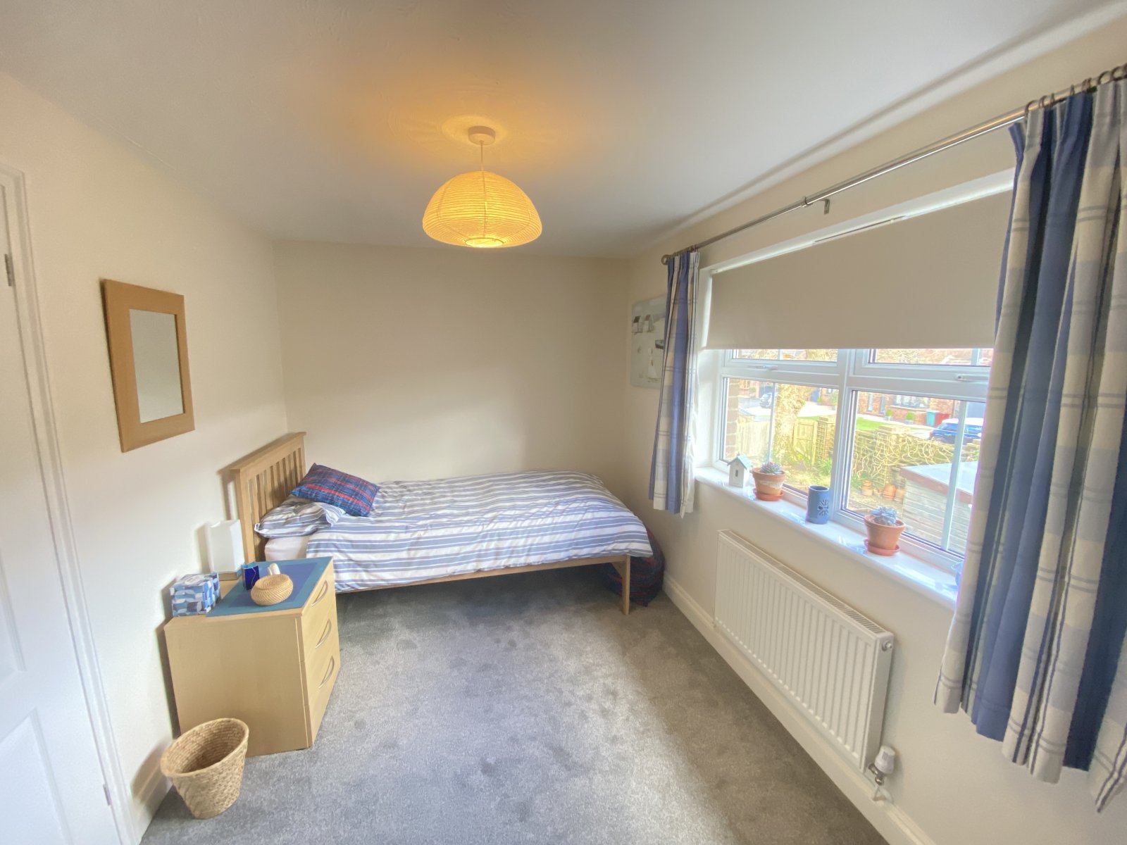 Carpeted, ceiling light, radiator, uPVC window to fore.