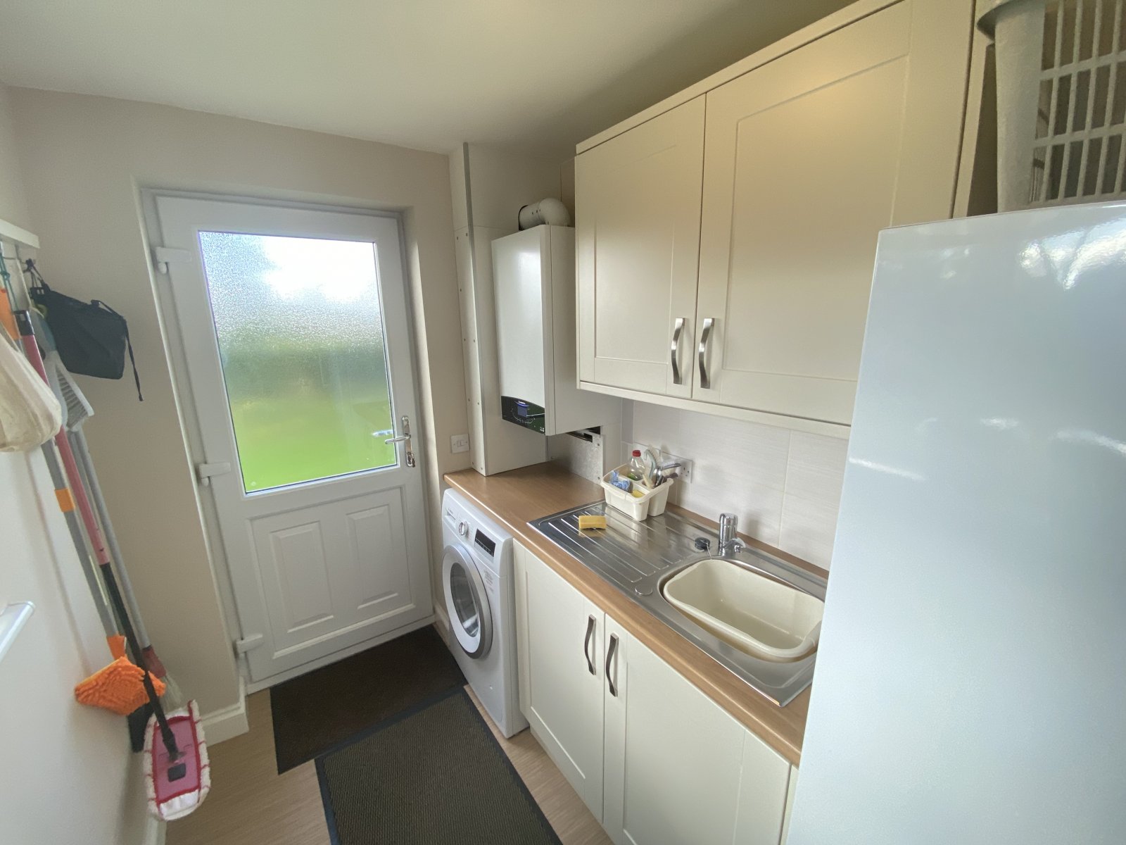 Cushion flooring, ceiling light, cream fitted units with wood effect worktops, tiled surround, stainless steel sink, space for washer and dryer, boiler, radiator, uPVC window to side, door to rear garden.