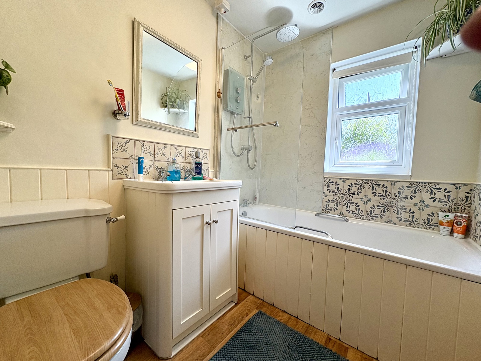 Timber effect cushion floor, heated towel rail, bath with shower over, wash hand basin, WC, part tiled walls, obscure double glazed window to front.