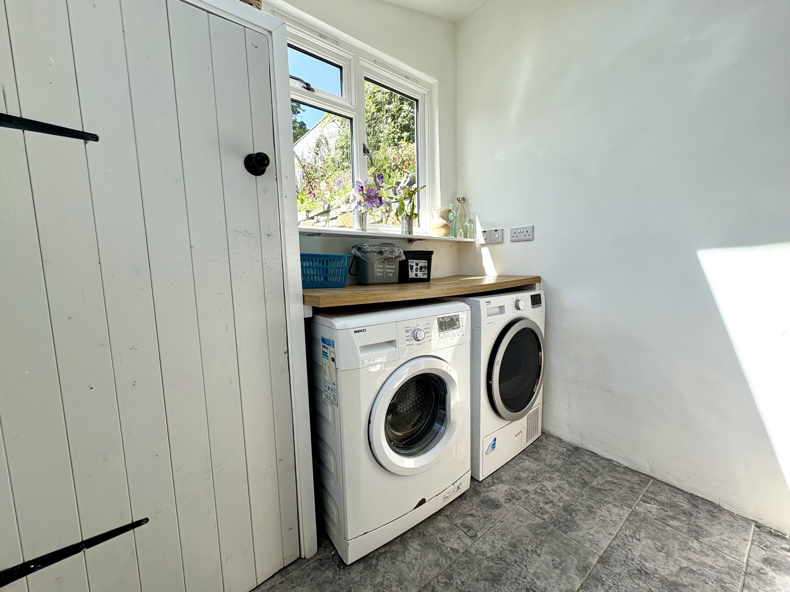 Tile floor, Velux skylight, plumbing for washing machine, space for tumble drier, built in storage cupboard, double glazed window to side, stable door to rear garden.