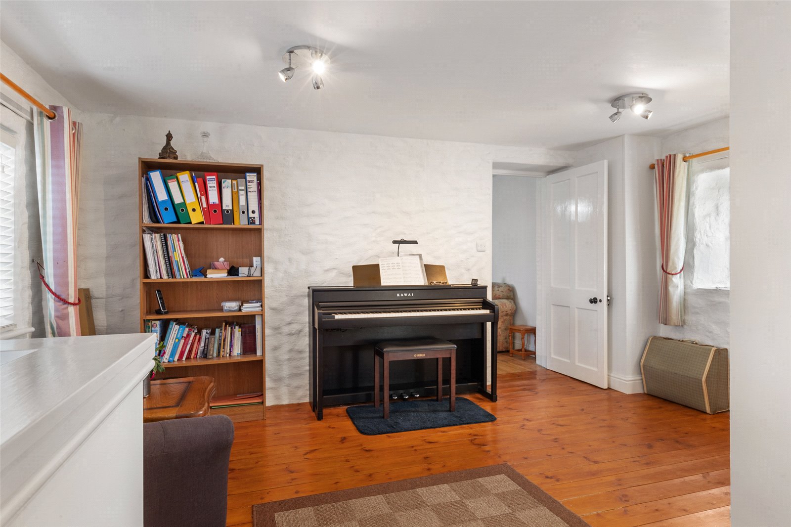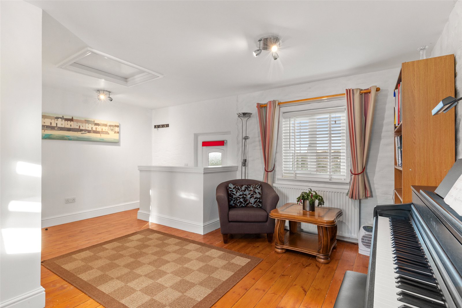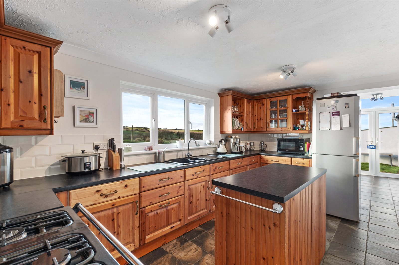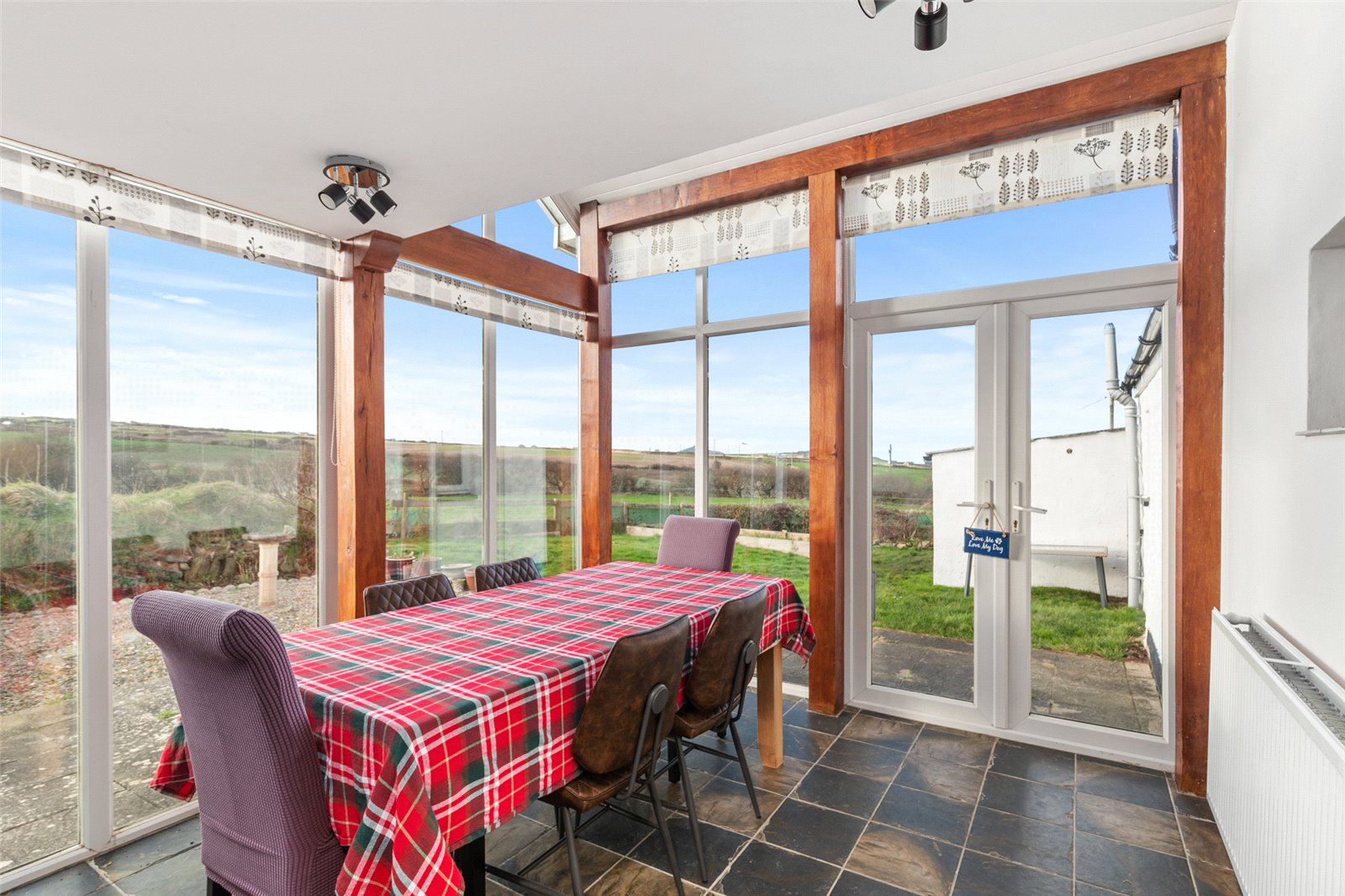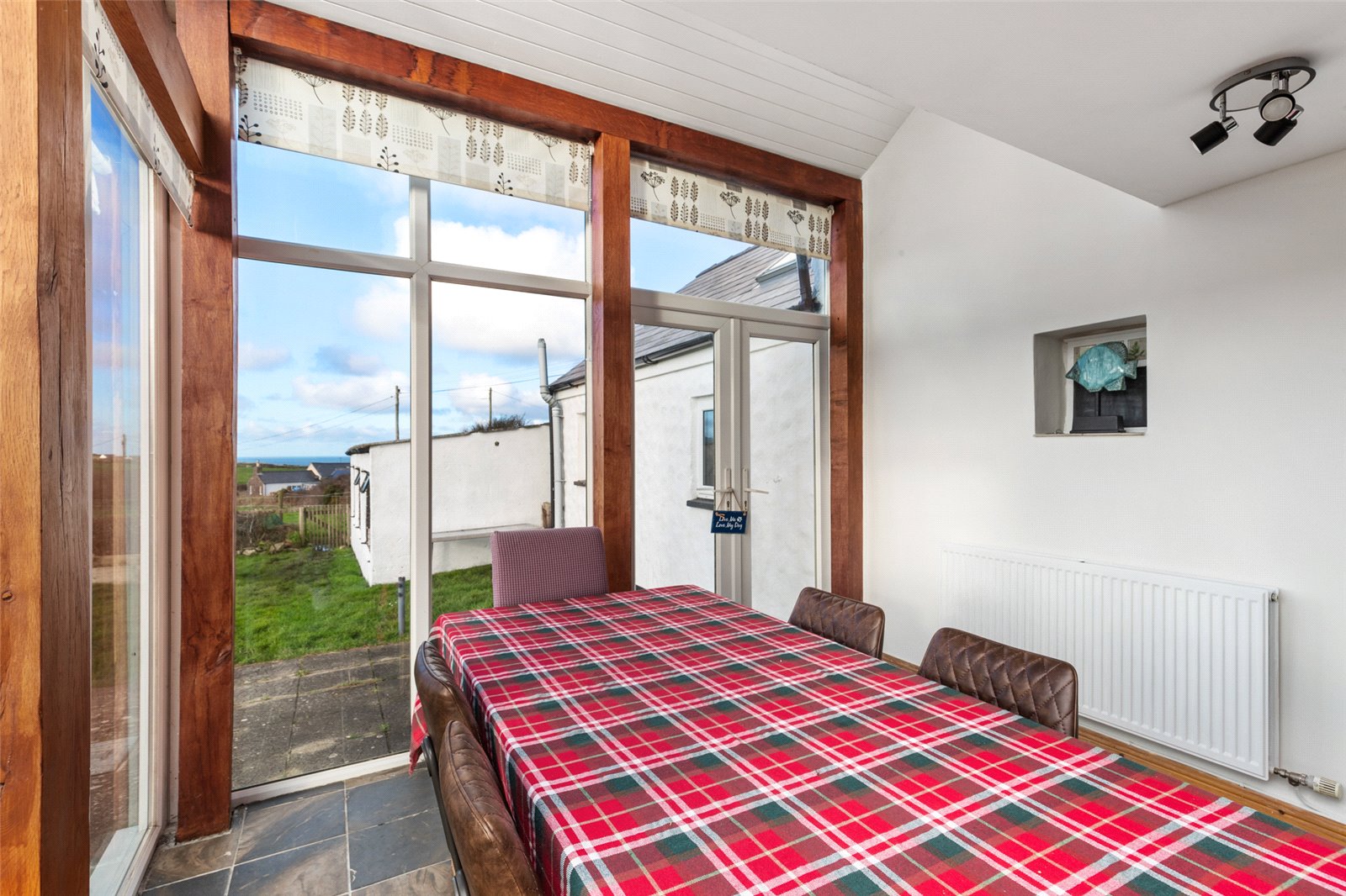 Bright and airy dining room, with vaulted ceiling, full height double glazed uPVC windows to side and rear giving picturesque views to the coast, French doors allowing for garden access, 2 x double-glazed skylights above, solid oak supports, tiled flooring, radiator and spotlighting.