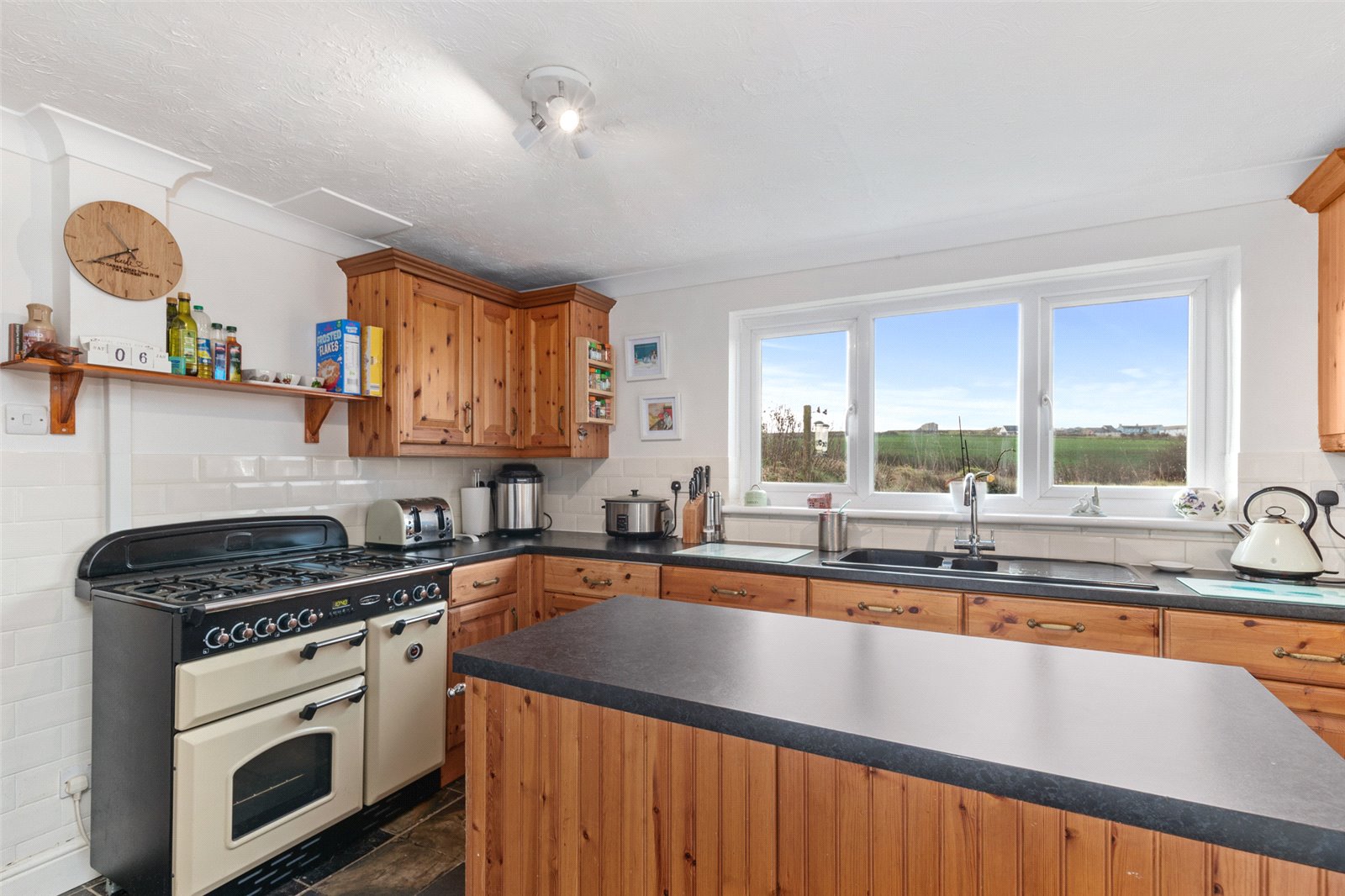 Sizeable kitchen to the rear of the property, with a range of solid wood base & wall units, as well as a kitchen island. Also benefitting from Rangemaster oven and gas hob, 1.5 sink and drainer, uPVC double-glazed window with scenic views to the rear, tiled flooring, spotlighting and radiator. Access to;