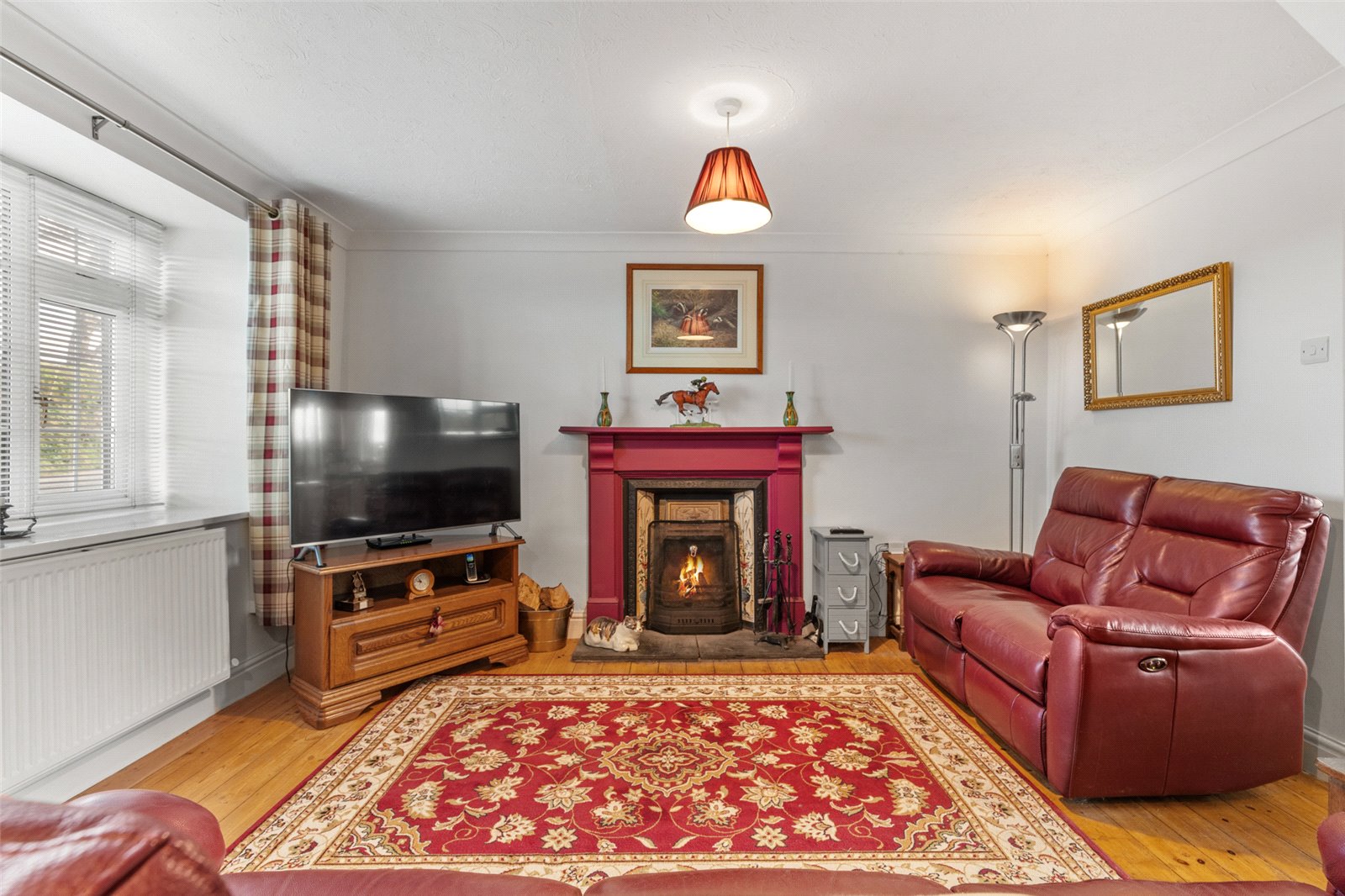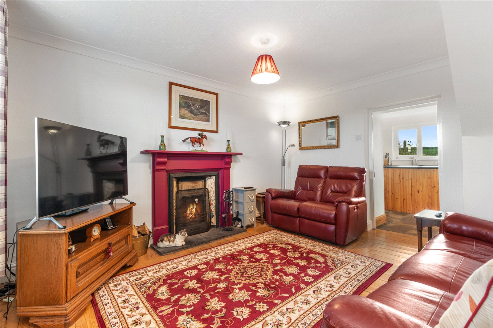 From the fore of the property, the uPVC front door gives access to a sizeable main lounge. Benefitting from wood flooring, open fireplace with wood mantel and slate hearth, uPVC double-glazed window to the fore, radiator and spotlighting. Access to;