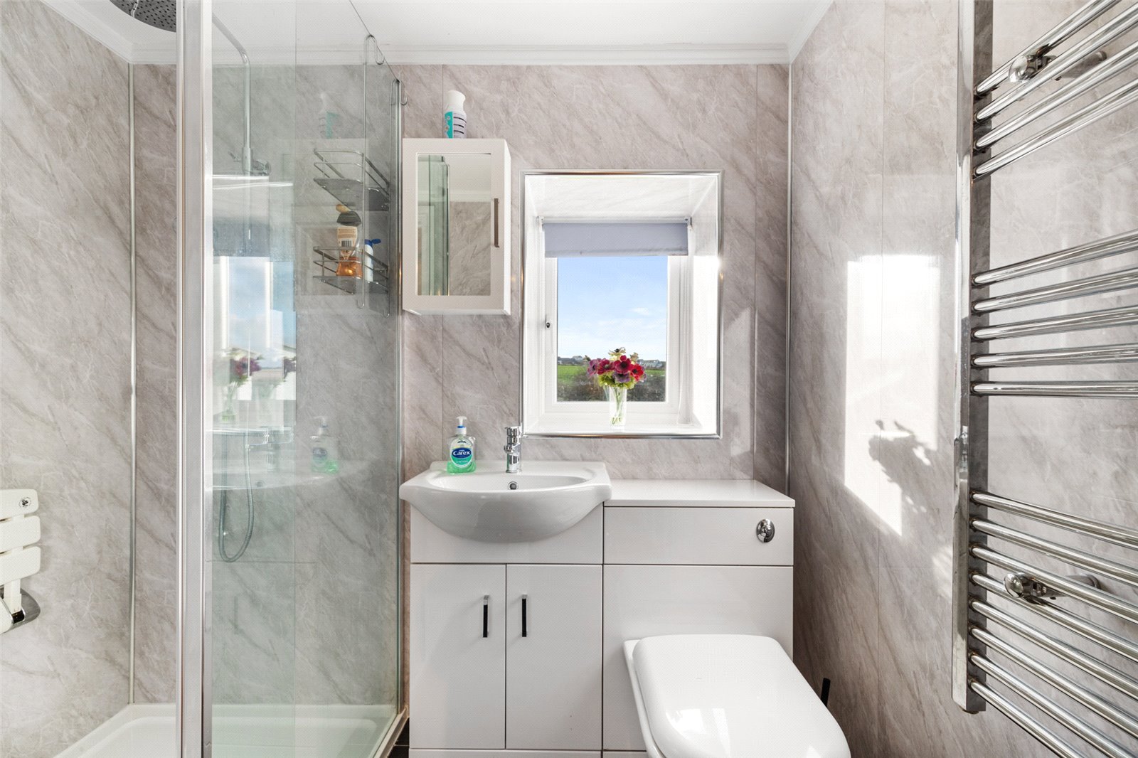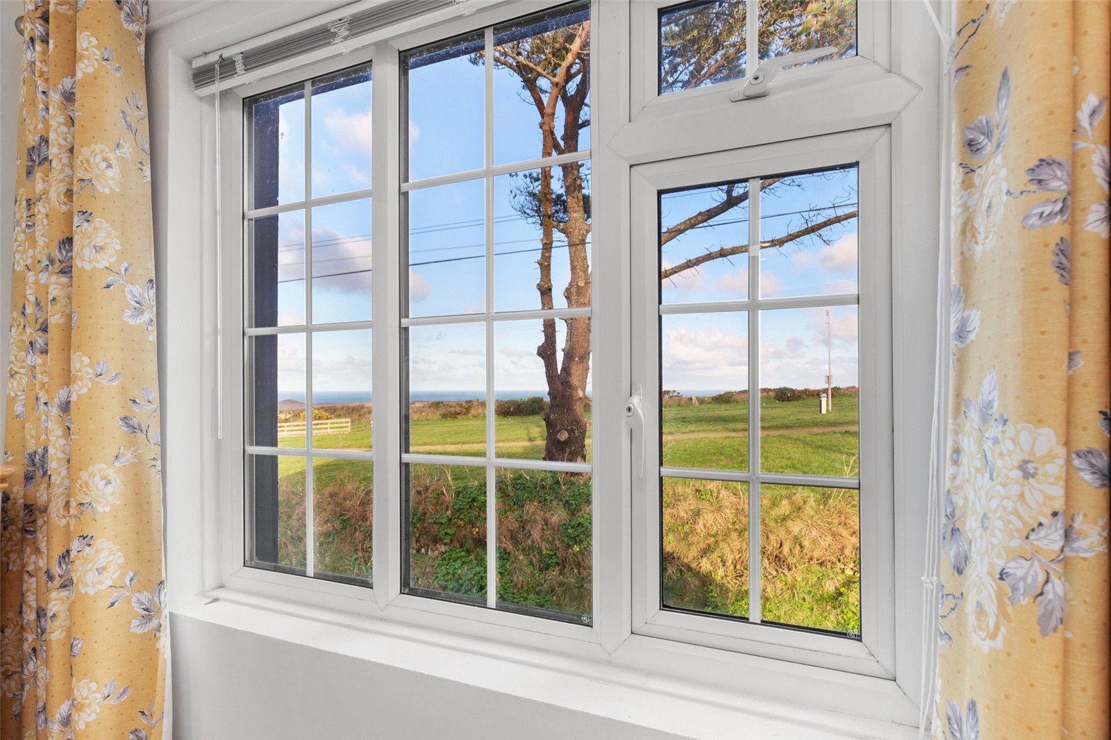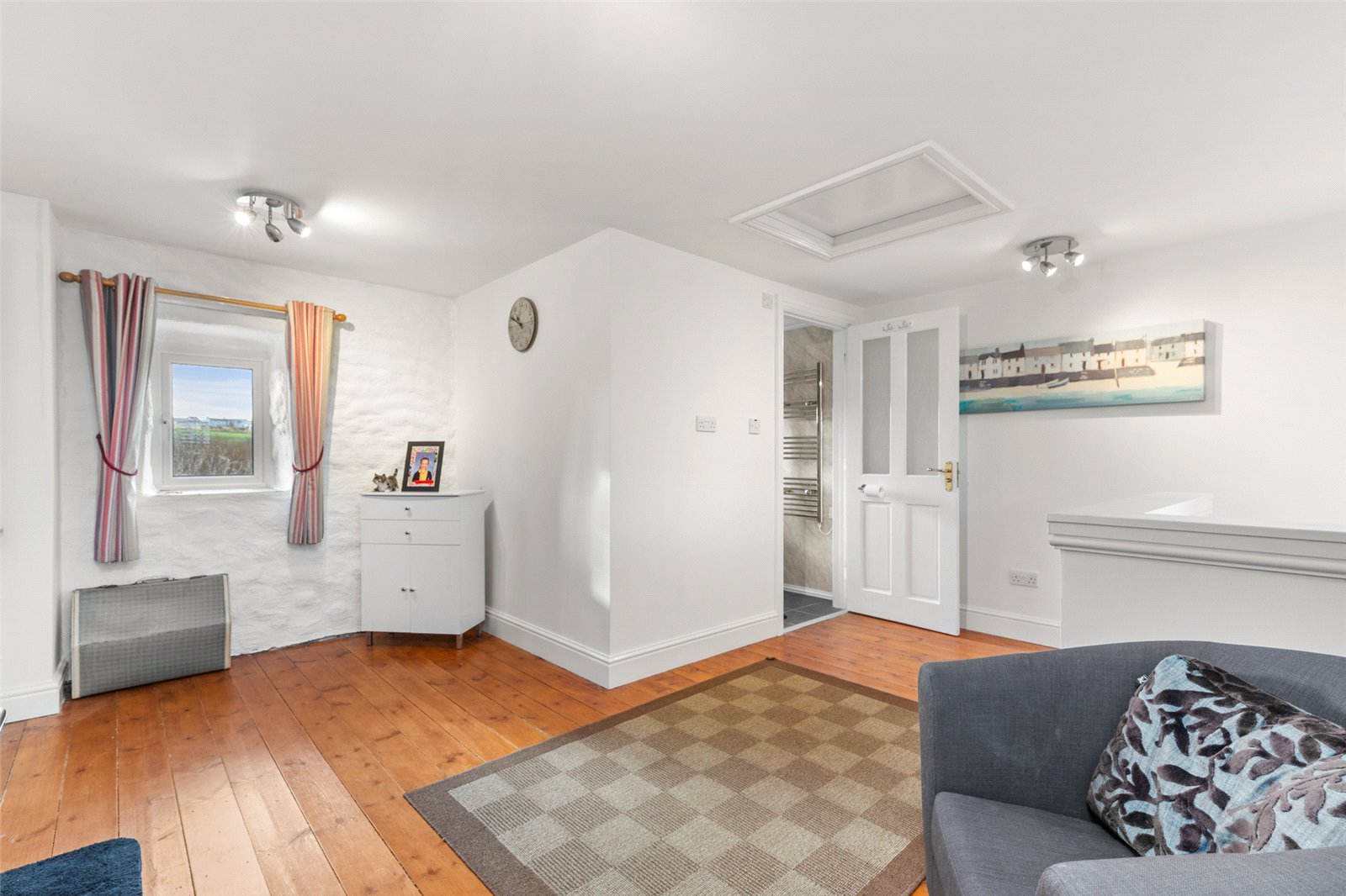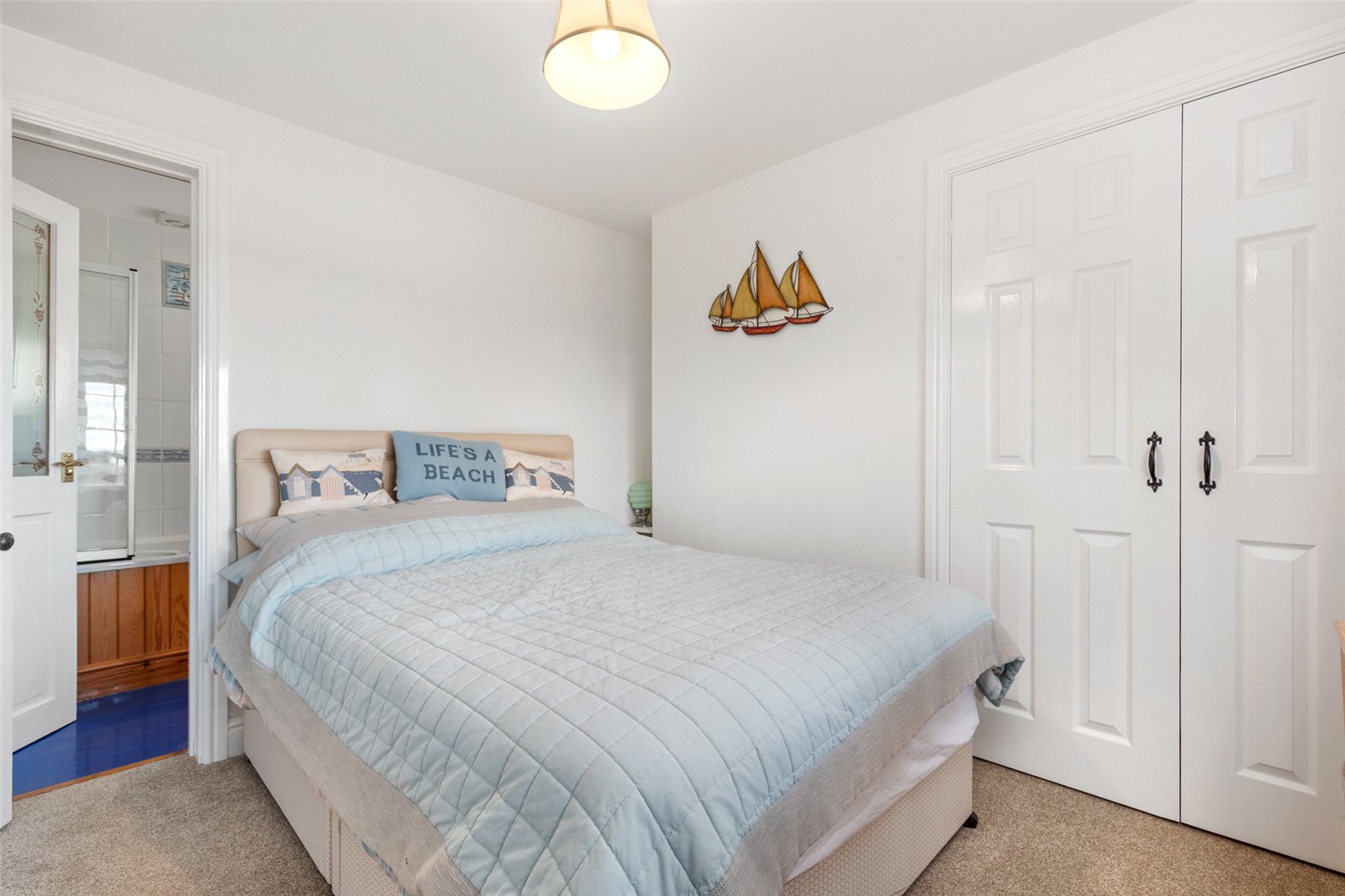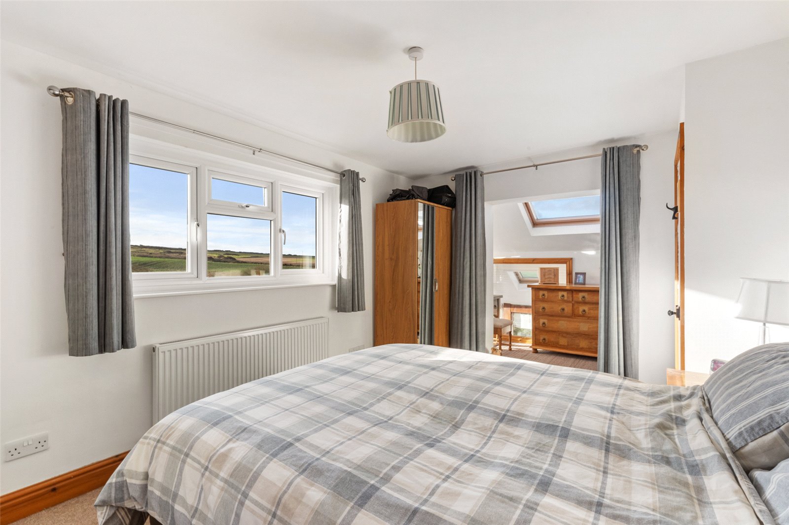 Rear-facing master bedroom suite, affording exceptional views through the uPVC double-glazed windows to the coast. Additionally, carpeted flooring, radiator, light fittings and access to;