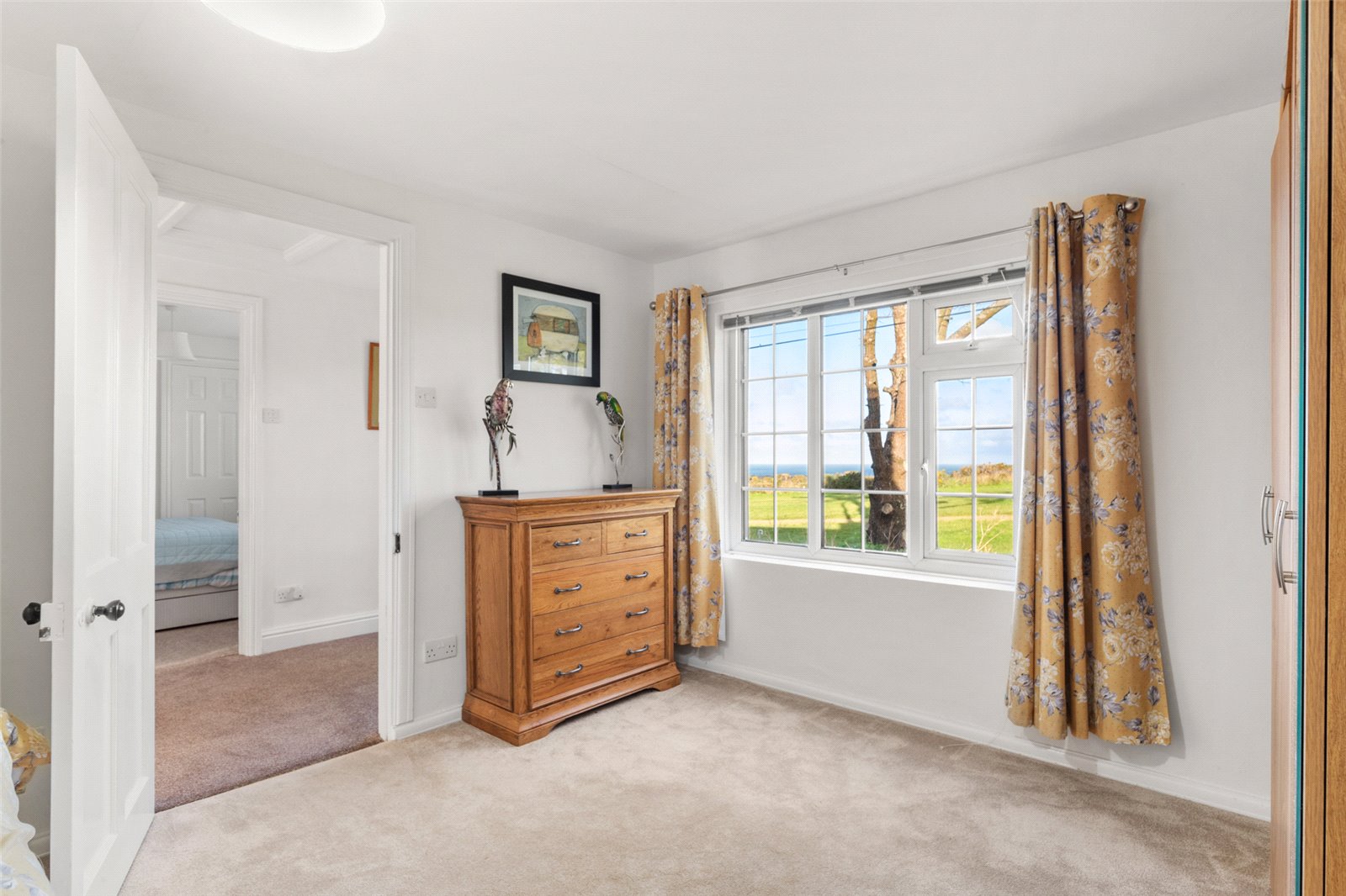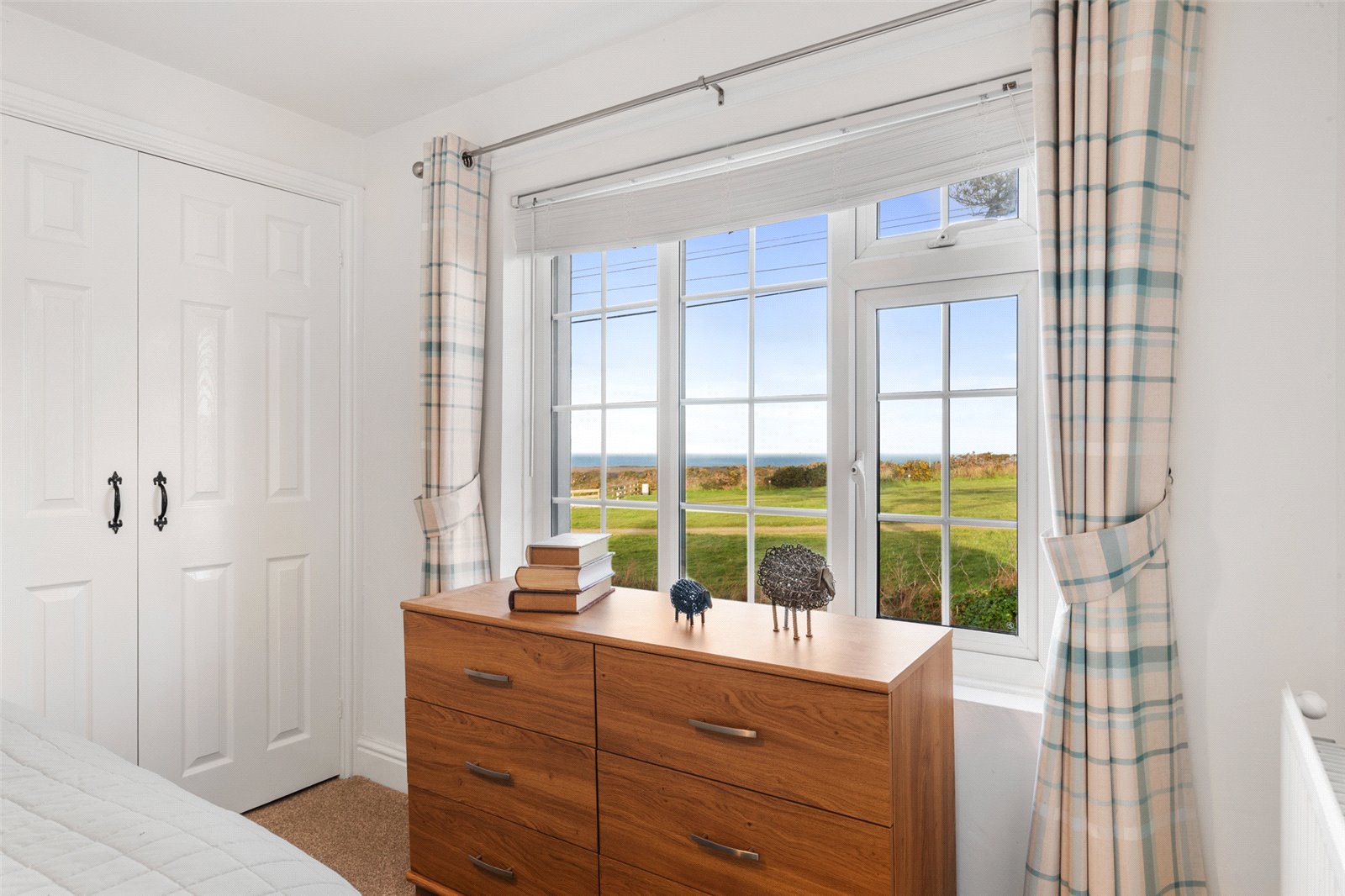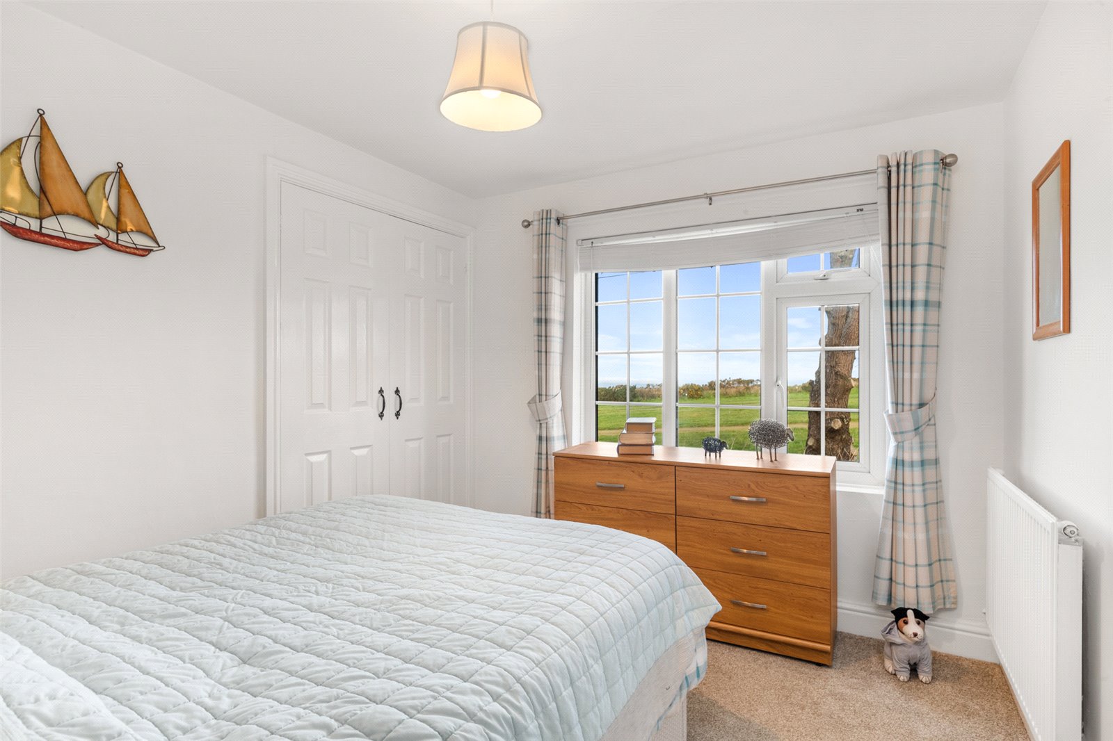 Large front-facing double bedroom suite, affording exceptional views through the uPVC double-glazed windows to the coast. Additionally, carpeted flooring, radiator, light fitting and airing cupboard.
