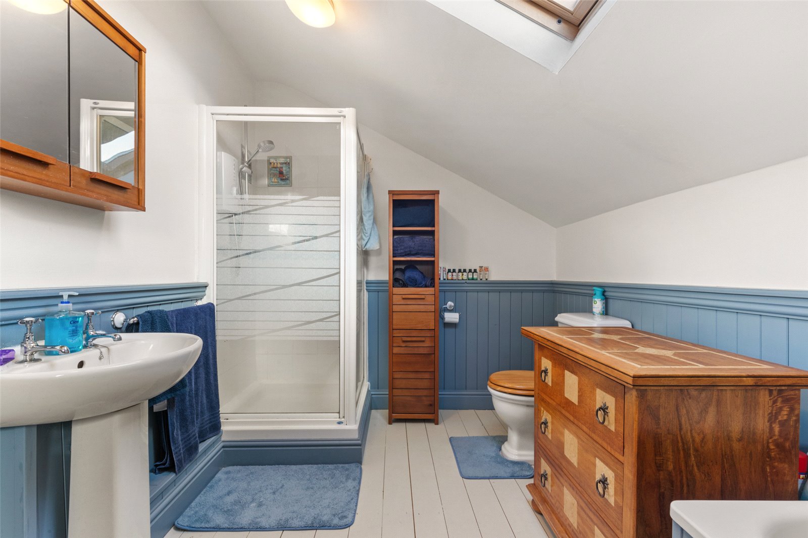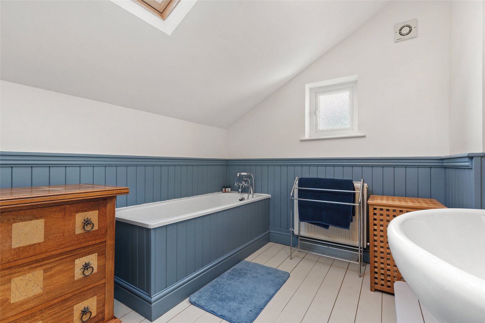 Sizeable en suite bathroom, comprising of bath, separate electric shower unit, hand wash basin, w/c, wood flooring, wood panelling throughout, Velux double-glazed window, extractor fan, lighting and radiator.