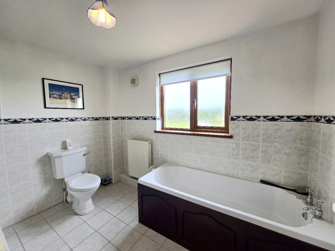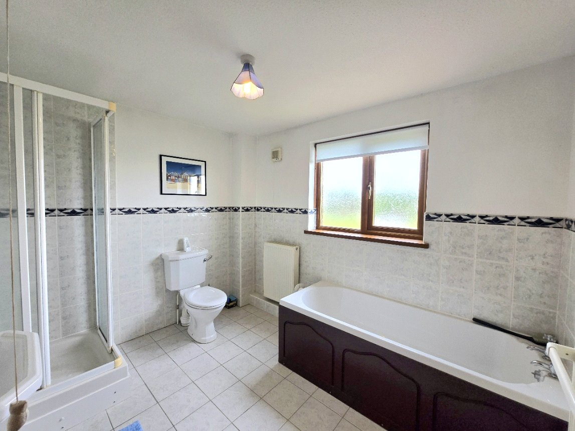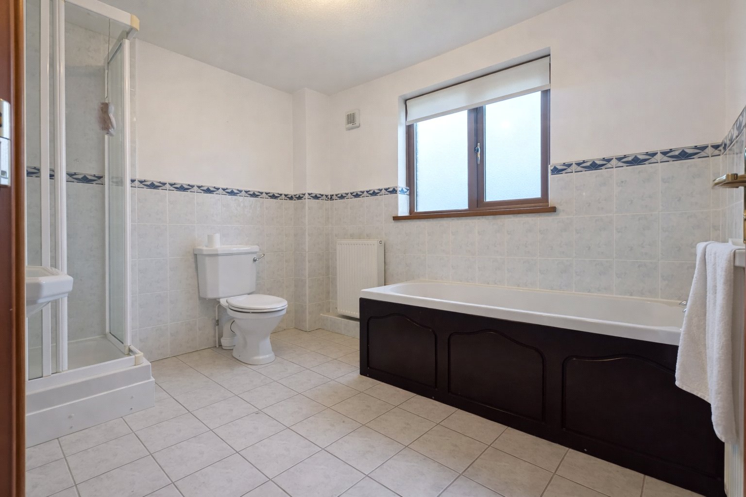 This spacious family bathroom is finished in a clean, classic style. The walls are partially tiled with a white, patterned tile and a distinctive blue and white border. The floor is covered with matching tiled flooring. The room is equipped with a three-piece suite, including a pedestal basin, a toilet, and a bathtub with a dark-paneled side. A separate corner shower unit with a glass enclosure is also a feature. Natural light is provided by a window with a roller blind.