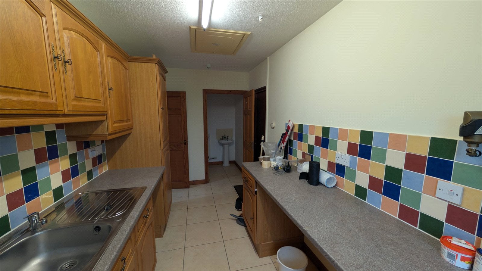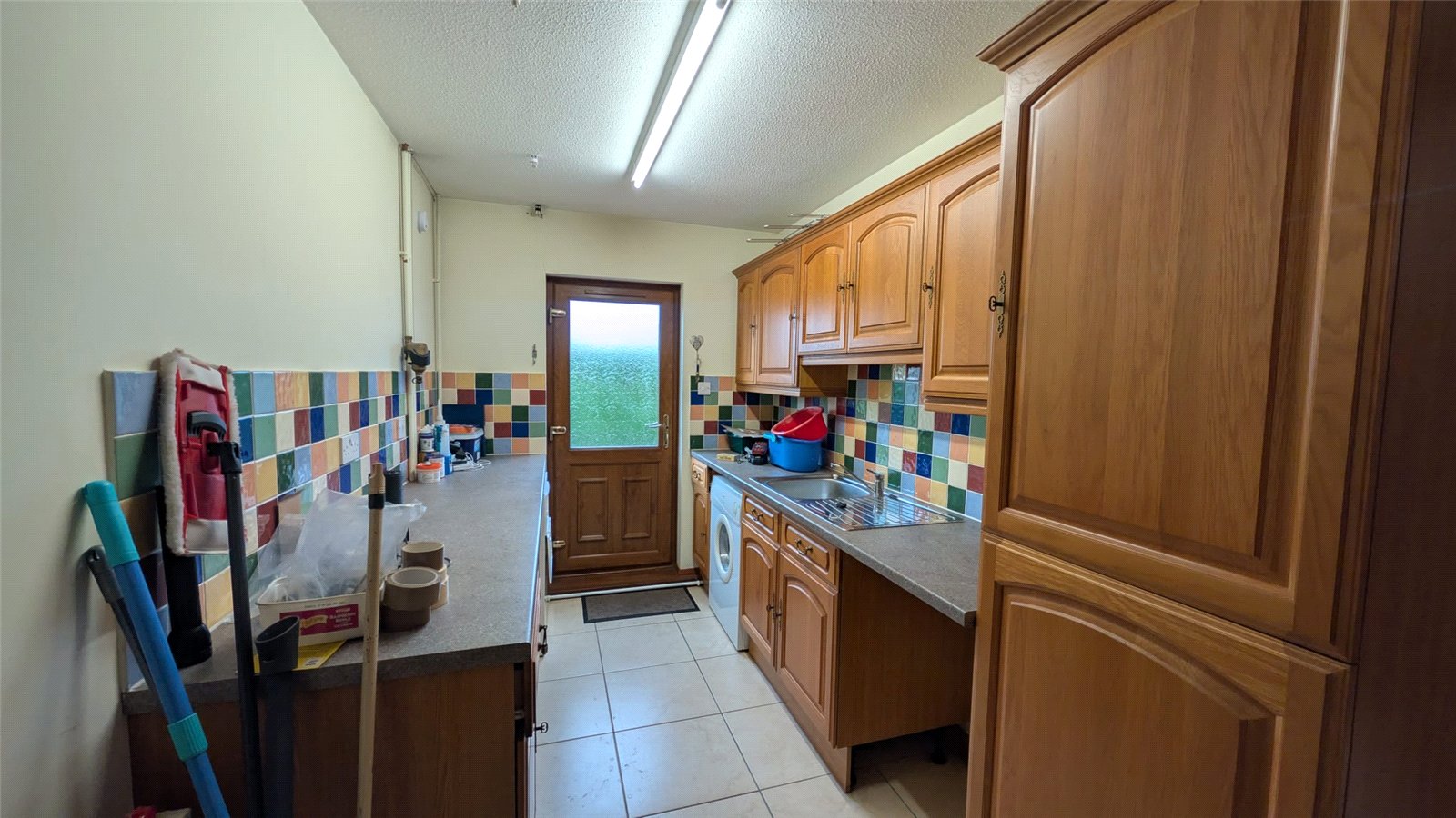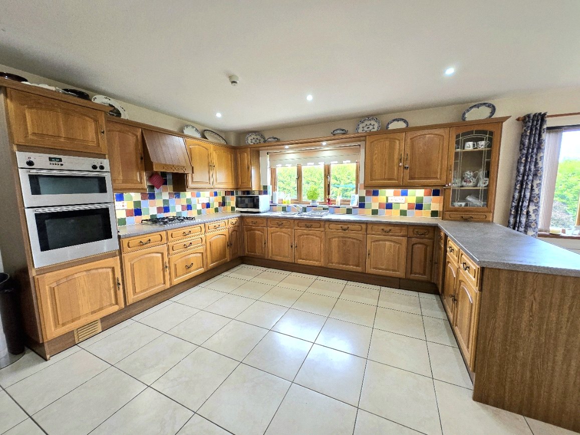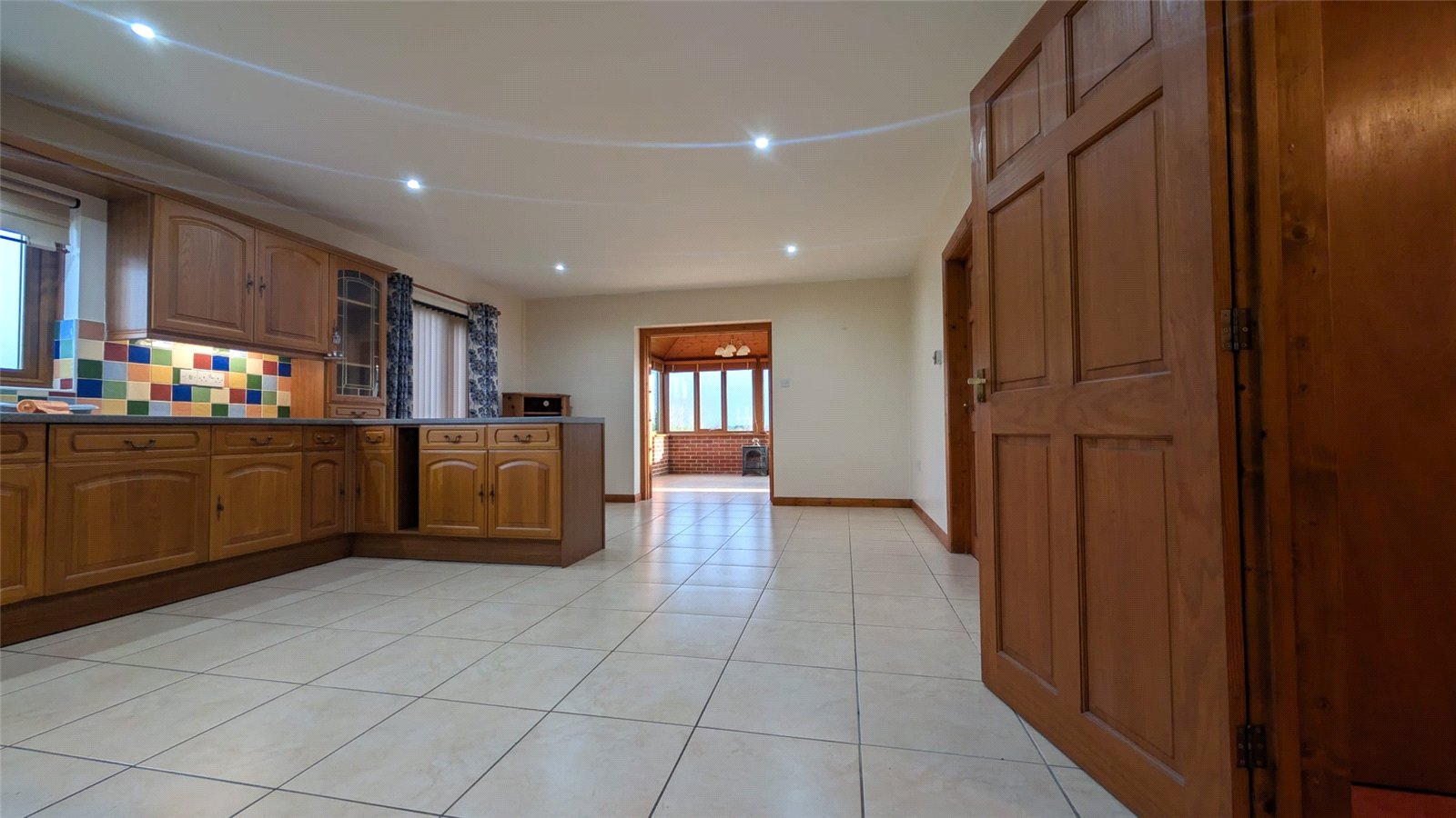 This kitchen-diner offers a practical and inviting space, ideal for both cooking and casual dining. The room features a U-shaped layout with light oak-effect cabinetry and a multi-colored tiled splashback that adds a cheerful element. Integrated appliances include a double oven and hob. A central breakfast bar provides a convenient space for informal meals. The floor is laid with large, light-colored ceramic tiles, ensuring durability and easy maintenance. Two windows, allow for plenty of natural light and offer views of the outdoors. The room also includes a utility room and is accessed by a traditional wooden door.
