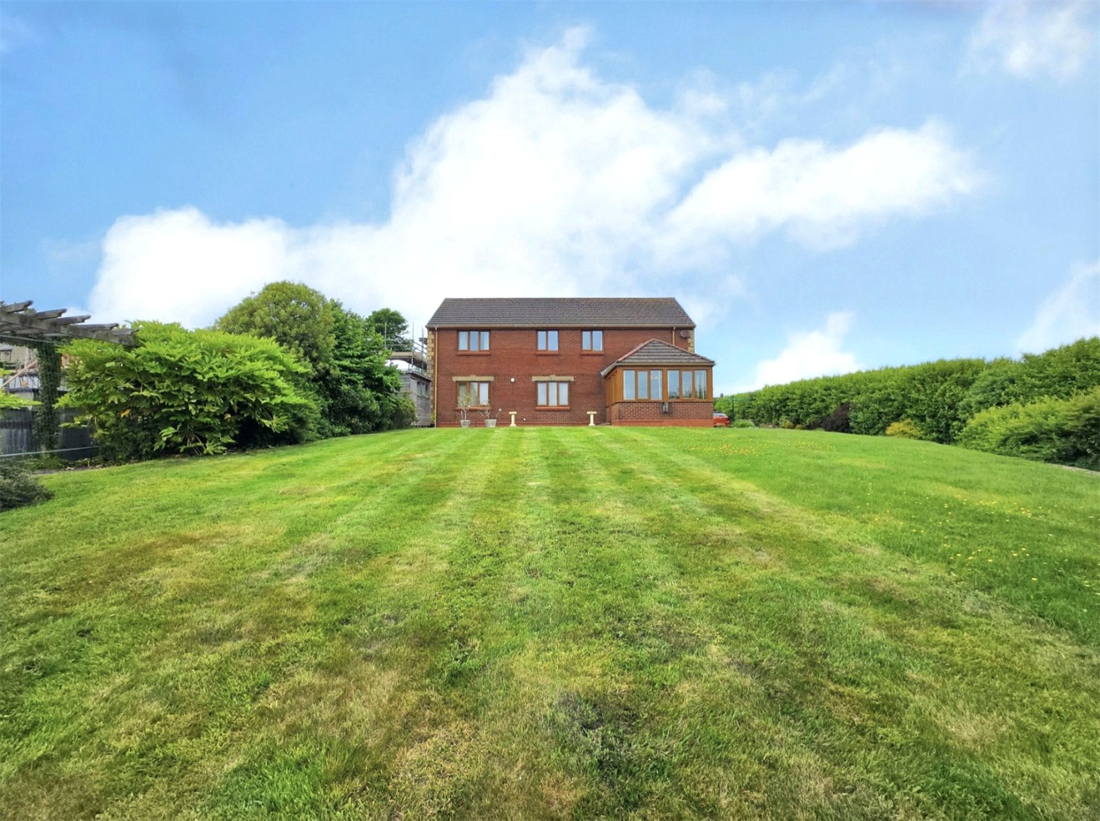 This well-maintained detached residence, situated in a serene setting in Haverfordwest, Wales, features a classic brick exterior and a tiled roof. The property is approached via a substantial tarmac driveway and a separate block-paved area, which together provide extensive off-road parking. A single-story extension, featuring a garage and a charming conservatory with wood-framed windows, complements the main house.