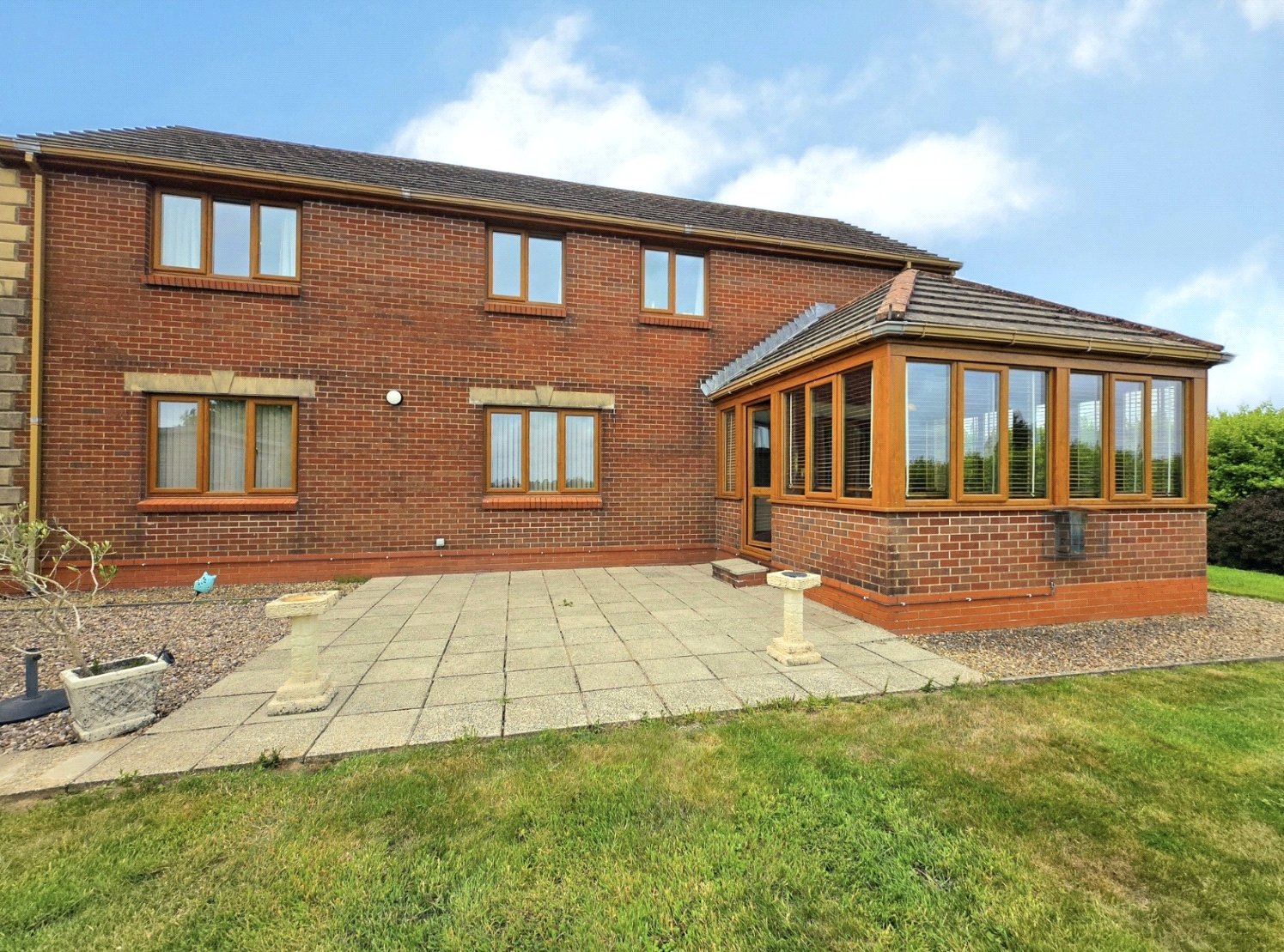 The rear of the property opens to a private and expansive garden. A large patio area, laid with paving stones, is accessible from the house, offering an ideal space for outdoor dining and entertaining. This transitions into a well-manicured lawn, bordered by mature hedges and trees that ensure privacy. A unique circular patio, complete with seating and a stone wall, provides a secluded retreat within the garden. The external areas are meticulously landscaped, offering a versatile and tranquil outdoor environment.