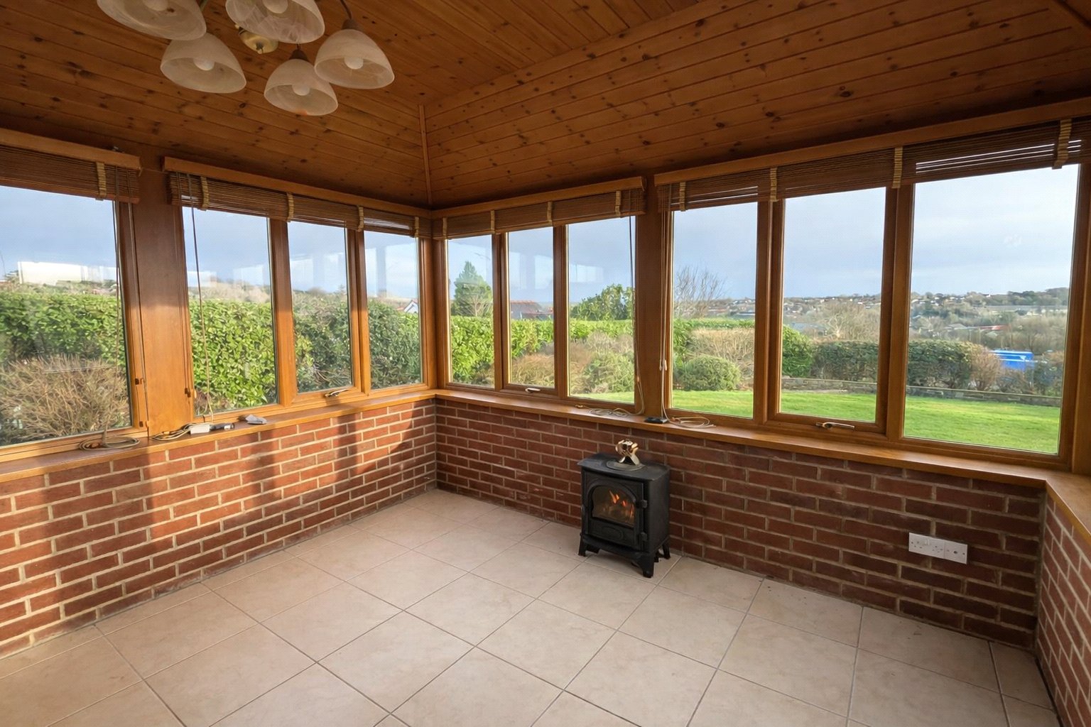 This charming conservatory provides a bright and inviting space with a rustic feel. The room features a striking combination of exposed brick walls and a sloped, wood-paneled ceiling, creating a warm, cozy atmosphere. An abundance of natural light streams in through multiple windows, each fitted with wooden blinds, offering panoramic views of the surrounding landscape. The room is floored with large, neutral-toned ceramic tiles, and includes a log-effect stove for added warmth. Access to the outdoors is provided by a glazed door, while an internal set of double doors connects the conservatory to the rest of the property.