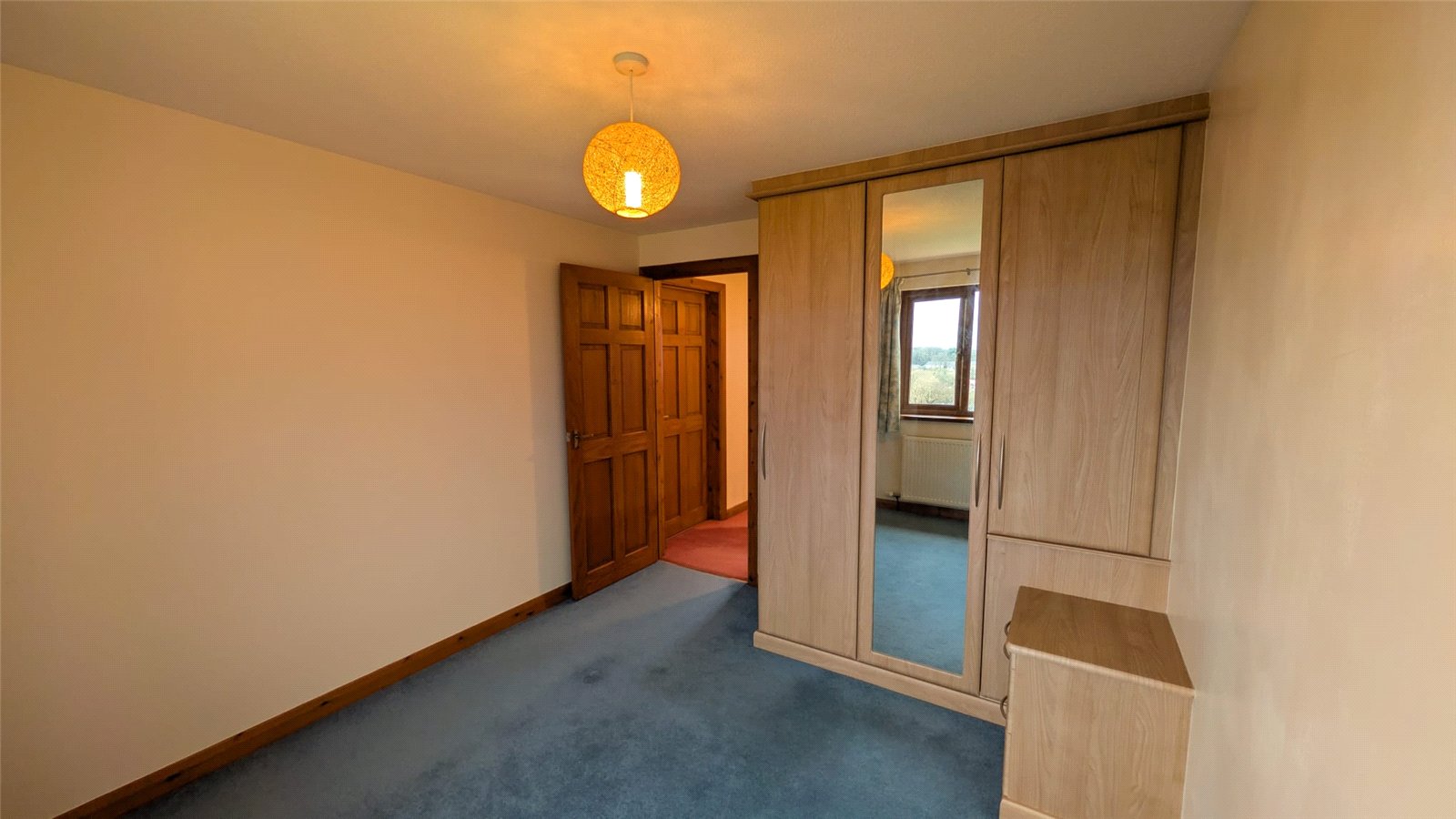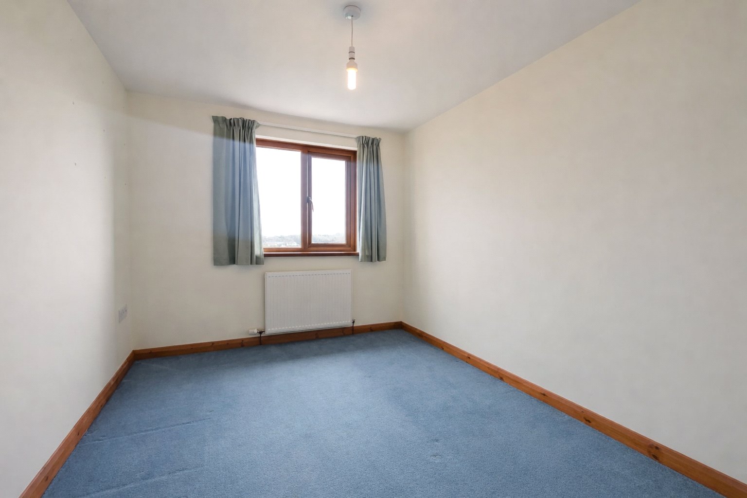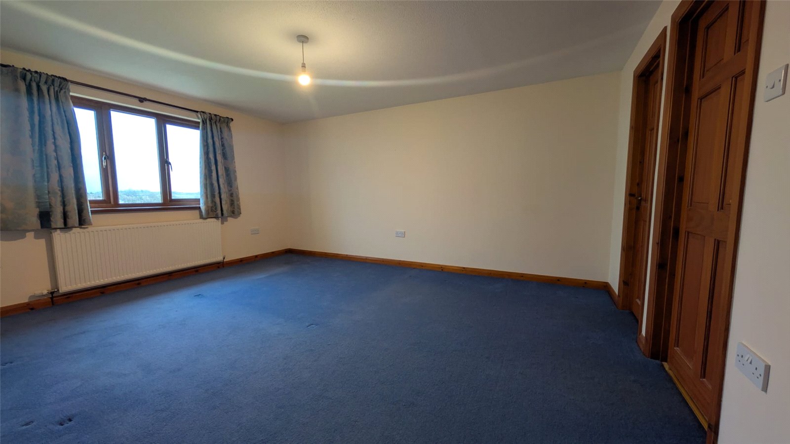 This double bedroom is an adaptable space with neutral cream walls and a contrasting blue carpet. The room benefits from a good amount of natural light from a window with a radiator below. Access to the room is through a classic wooden door, and it includes a built-in storage area. The space is currently minimally furnished, offering a blank canvas for personalization.