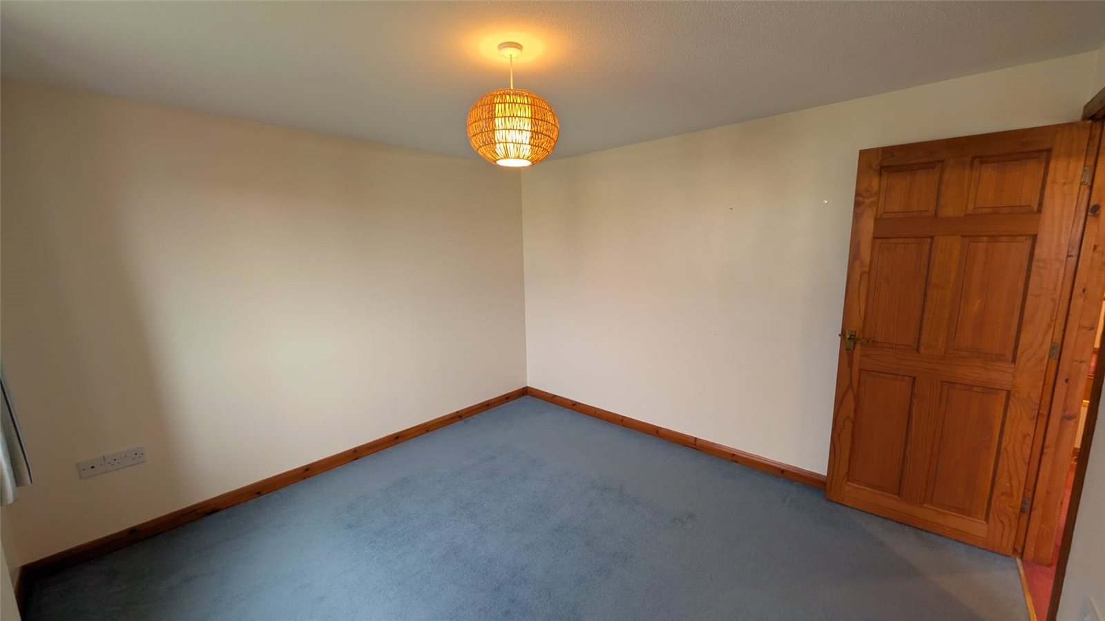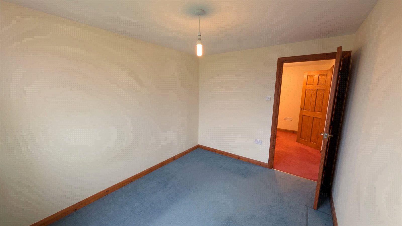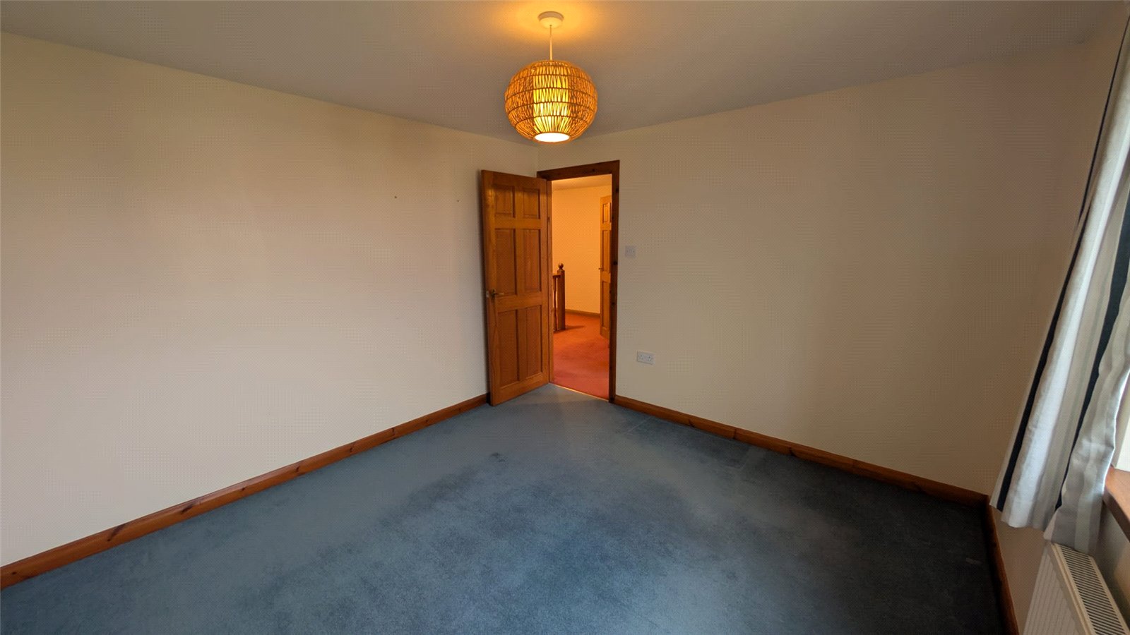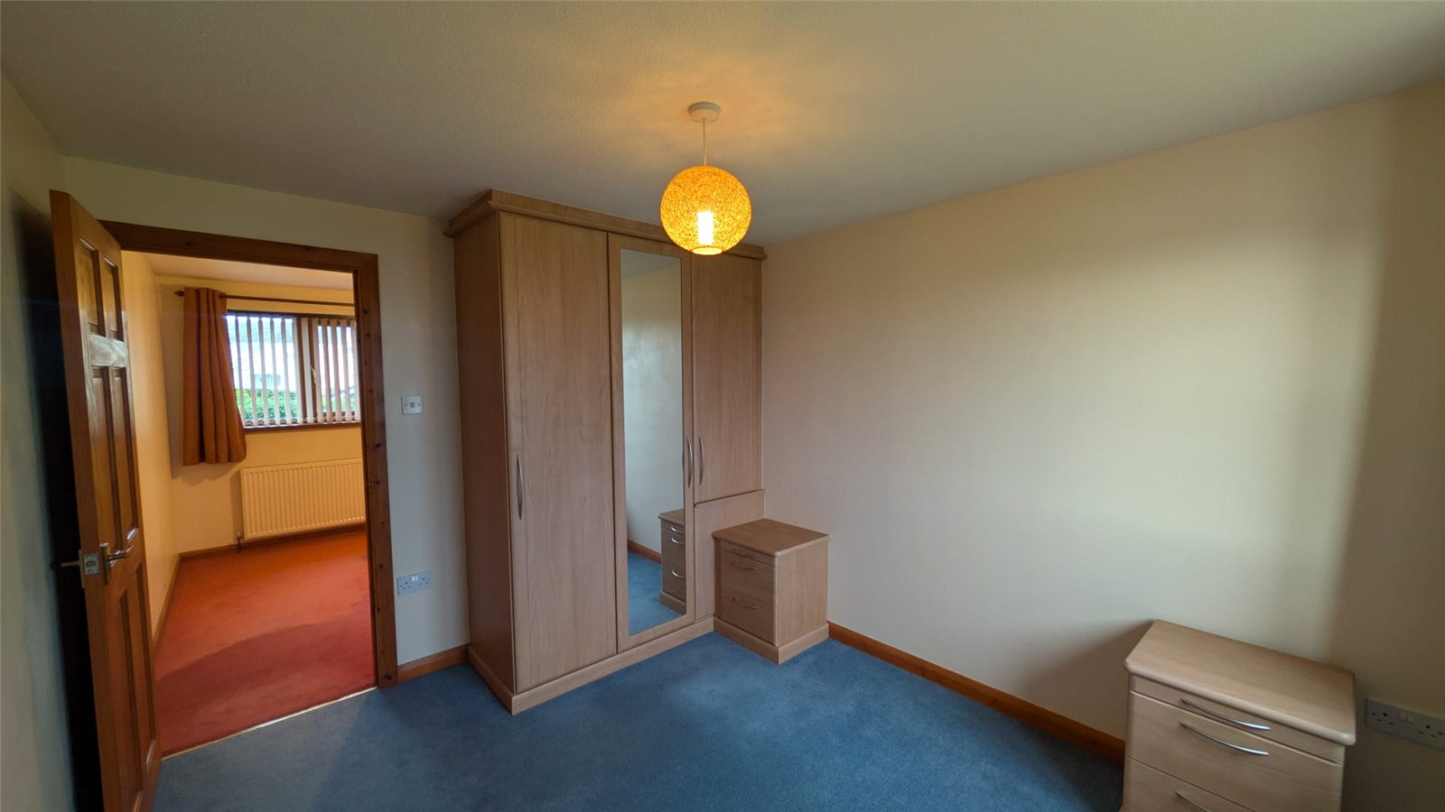 This double bedroom is an adaptable space with neutral cream walls and a contrasting blue carpet. The room benefits from a good amount of natural light from a window with a radiator below. Access to the room is through a classic wooden door, and it includes a built-in storage area. The space is currently minimally furnished, offering a blank canvas for personalization.