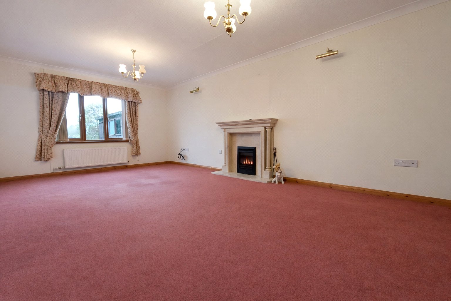 This generously proportioned reception room offers a traditional aesthetic, featuring a deep rose-hued carpet and neutral cream walls. Natural light is abundant, entering through a substantial window adorned with patterned drapery and vertical blinds. A focal point of the room is the elegant stone fireplace, complete with a mantle.