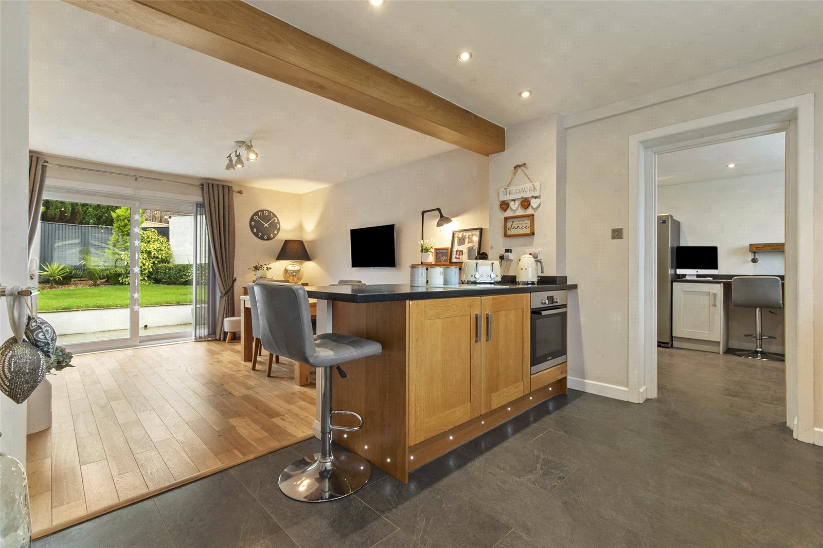 Upon entering, you are welcomed by a warm and inviting hallway. The ground floor accommodation is both versatile and well laid out, comprising a superb open-plan kitchen / snug / dining area with doors opening directly onto the private rear garden, which has also been attractively renovated. Off the main kitchen is a highly practical home study / utility / overflow kitchen, ideal for modern family living or working from home, and again offering access to the rear garden.