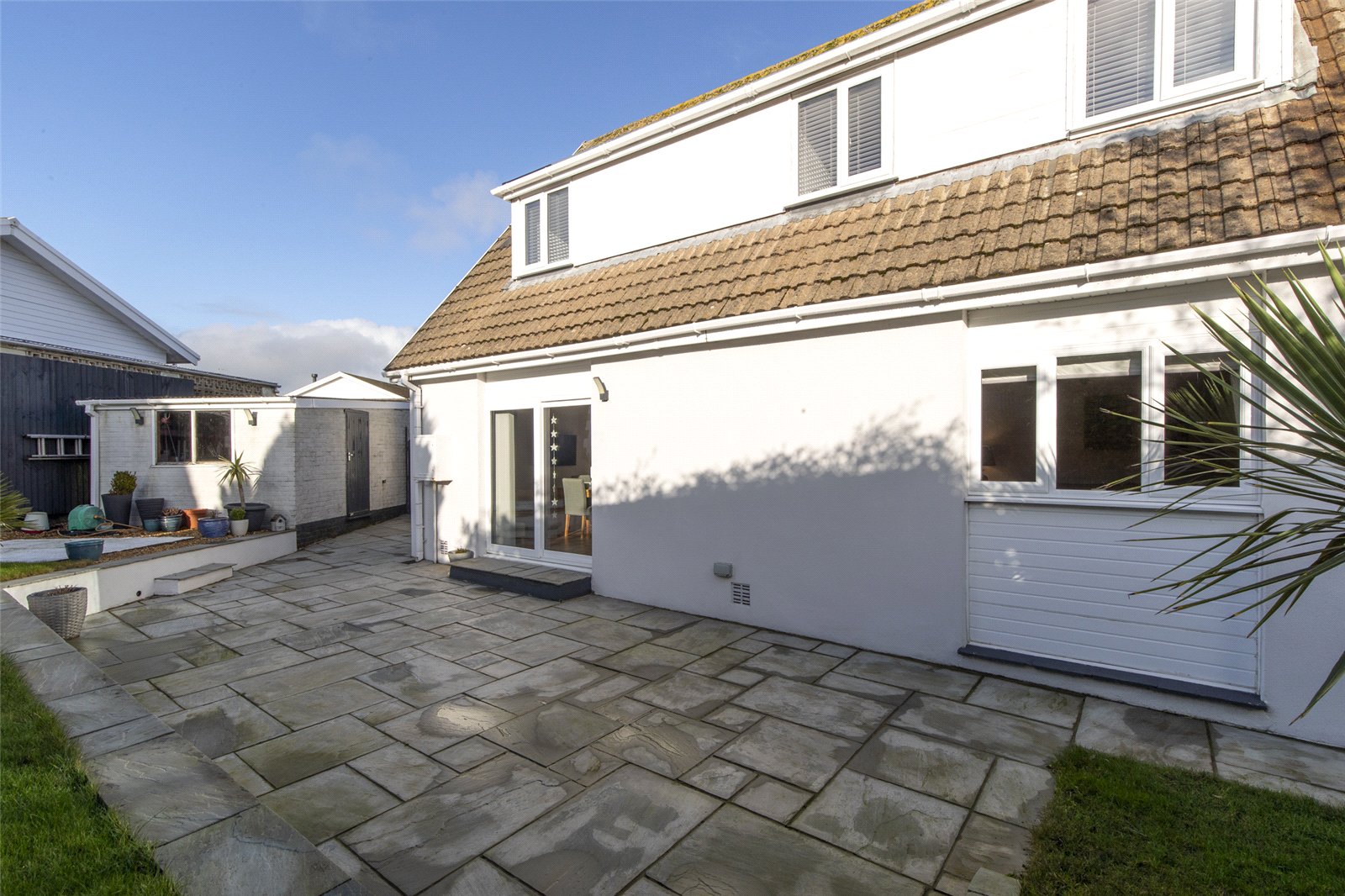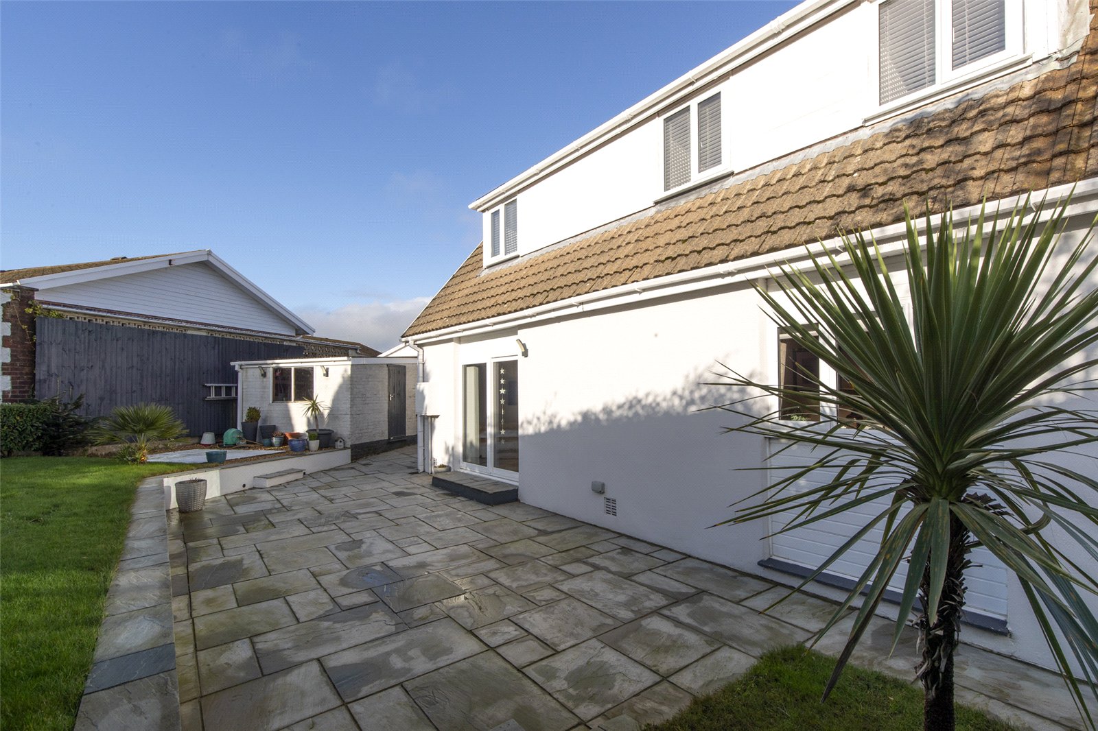 Externally, this corner plot enjoys a well-maintained grassed frontage, with two side access points leading to the rear garden. The rear garden is perfect for entertaining, featuring a large patio area ideal for al fresco dining, a lawn, and a variety of established shrubs and plants.