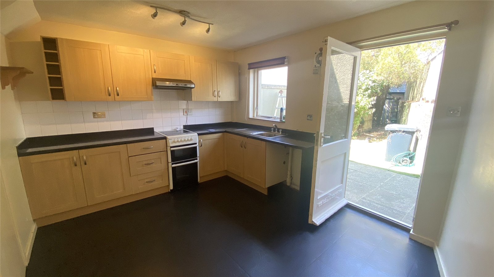 Rear-facing kitchen/diner, comprising of a range of base & wall units, with electric oven, integrated extractor fan/lighting, stainless steel sink and drainer to the uPVC double-glazed window, slate flooring, rear garden access door, dining table space, spotlighting and radiator.