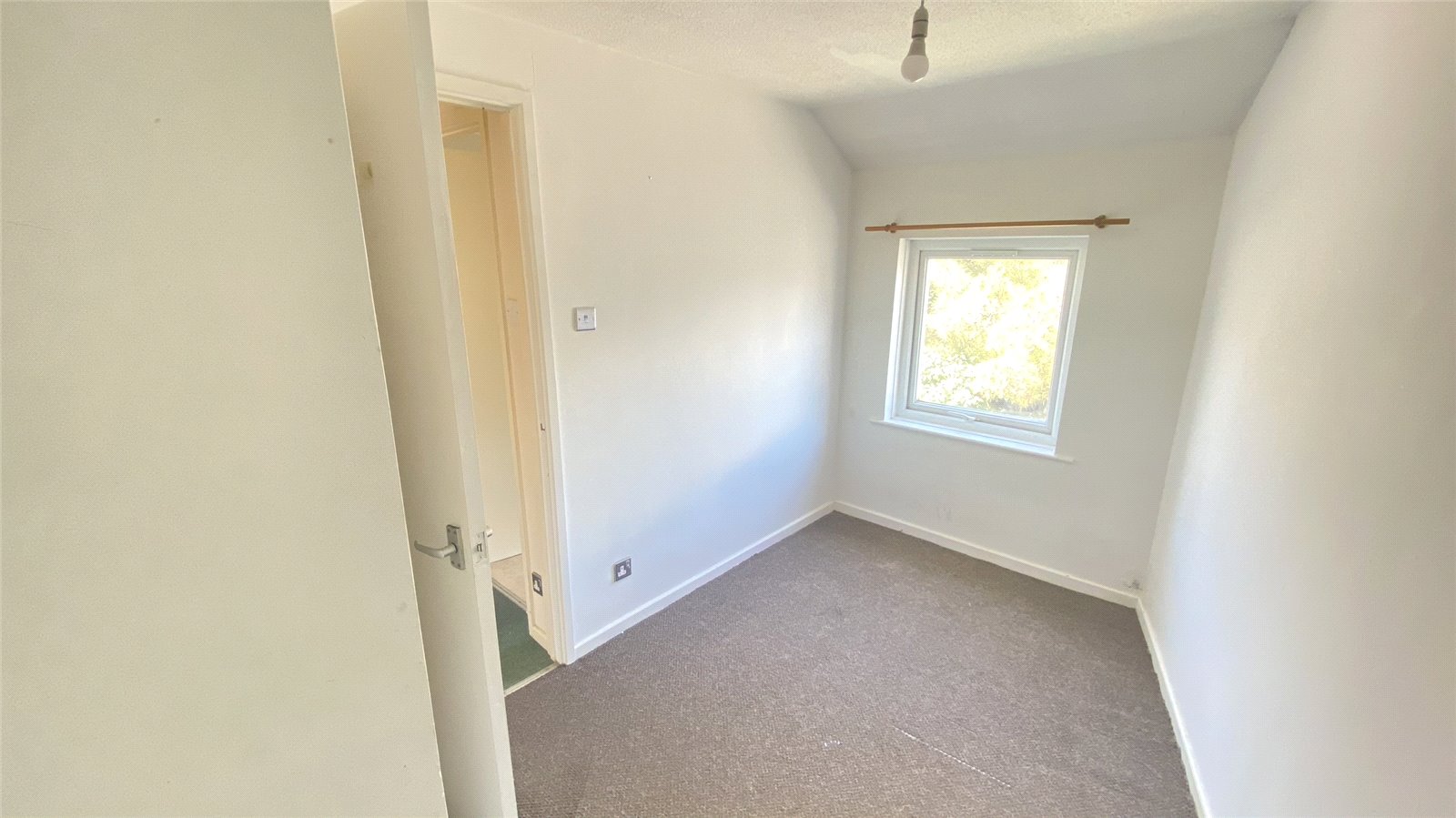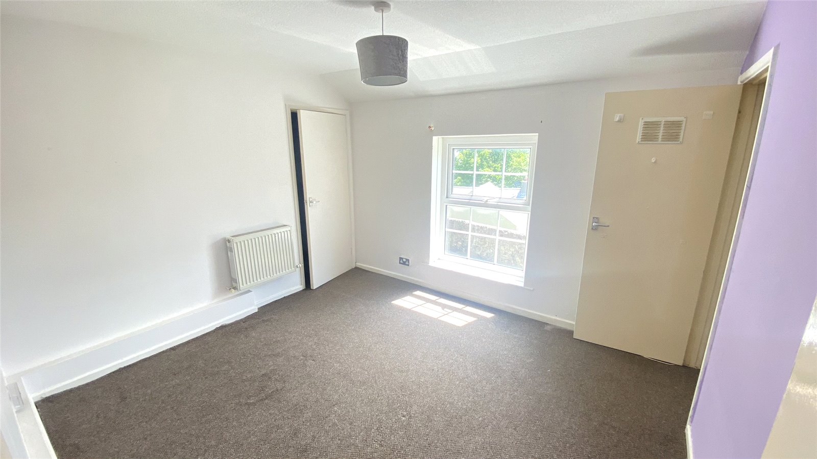 Rear-facing bedroom, comprising of uPVC double-glazed window, carpeted floor, light fitting and radiator.