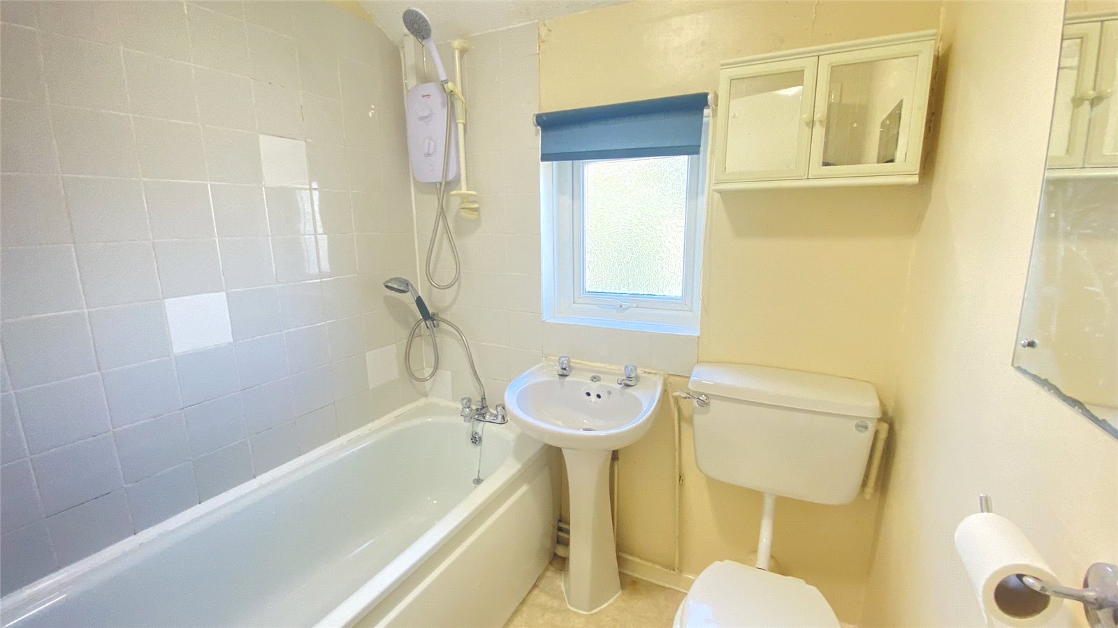 Family bathroom suite, with bath, overhead electric shower, wash basin, w/c, uPVC double-glazed window with obscure glass, partially tiled wall, linoleum flooring and light fitting.