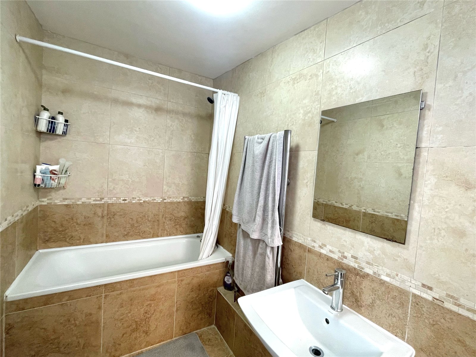 Tiled floor and walls, WC, wash hand basin with mixer tap and mirror above, heated towel rail, fitted bath with mixer tap and shower with shower curtain.