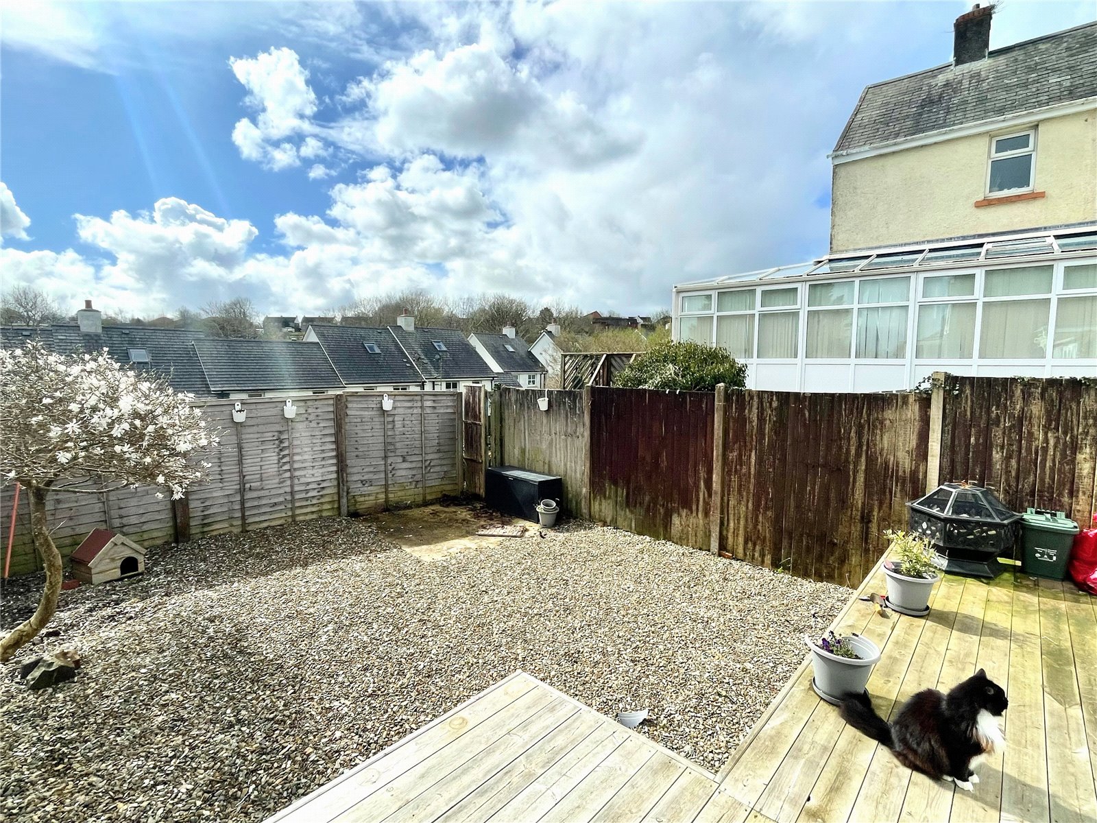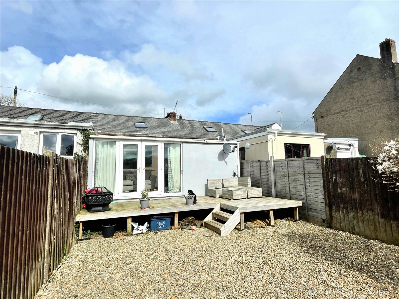To the rear is a new decking area with steps down to a gravelled garden. The garden is enclosed with a new fence to the rear.