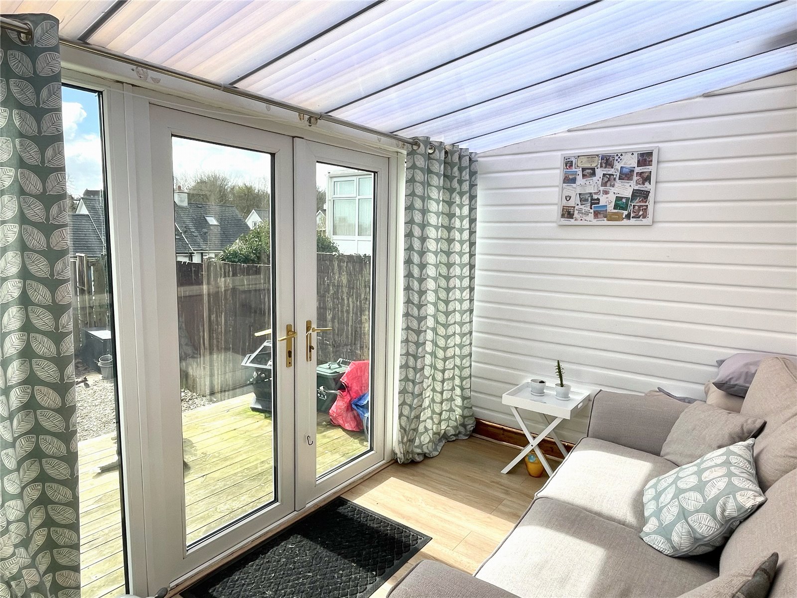 Glazed conservatory with polycarbonate roof, radiator, laminate flooring, door to utility room, uPVC double glazed French doors to garden.