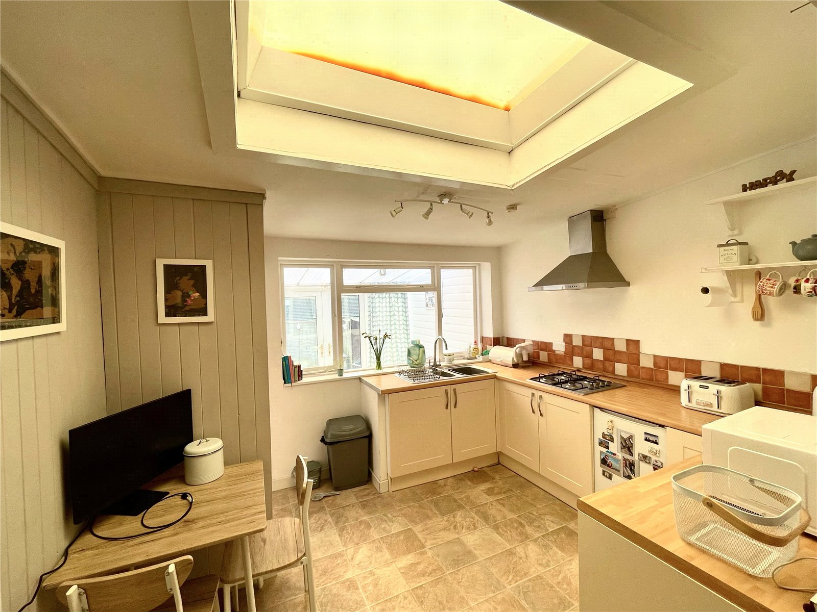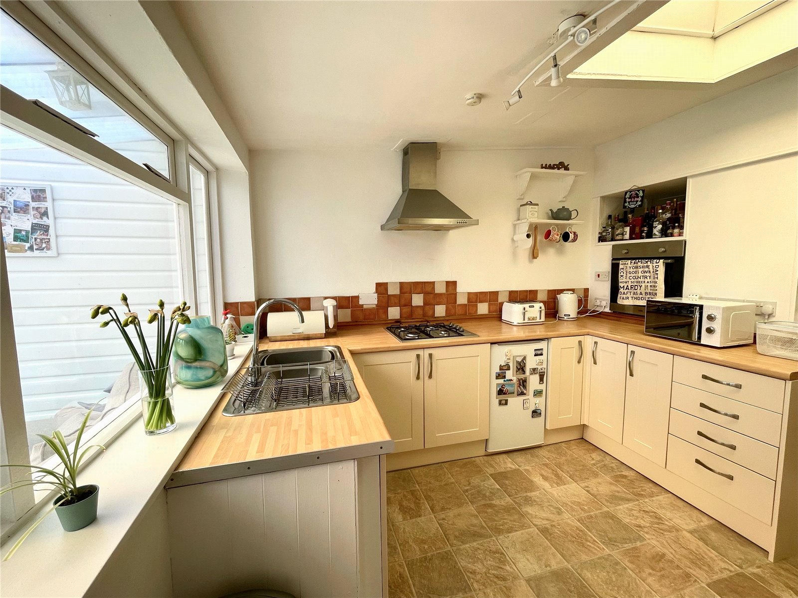 Range of base units, space for fridge, integrated gas hob and eye level oven. Overhead extractor fan and light, ceiling light, vinyl flooring, sky light, radiator, wooden single glazed window into conservatory.