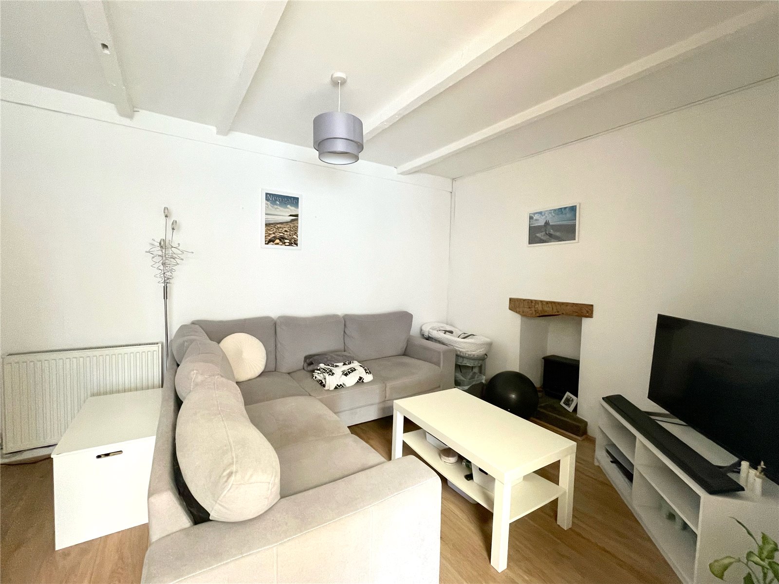 New laminate flooring, ceiling light, radiator, exposed painted ceiling beams, staircase to first floor, open hearth with wooden mantle over and slate hearth, stairs to first floor. Steps into: