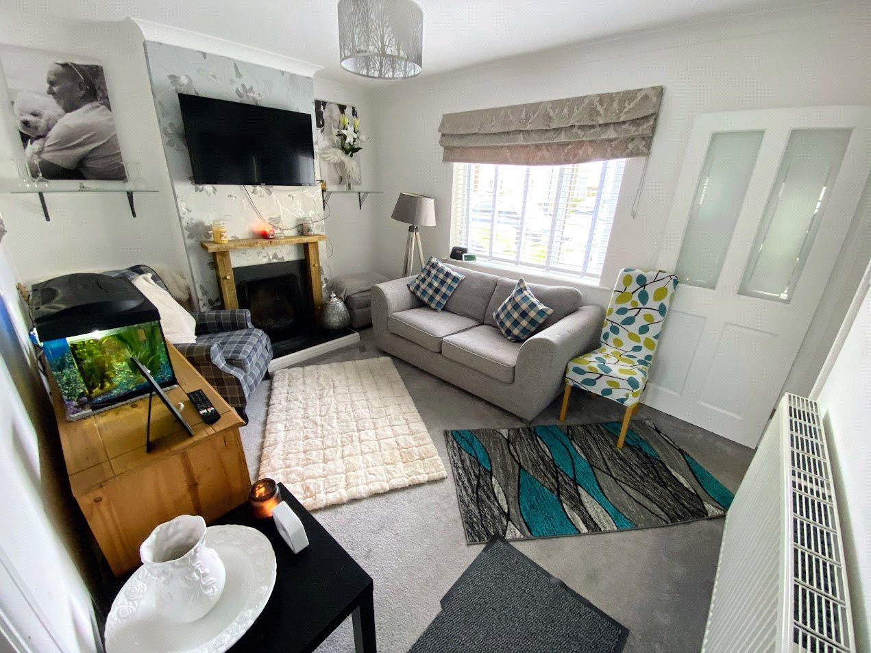 Carpeted floor, solid fuel working fire with wooden mantel and slate hearth, uPVC double glazed window, pendant light, radiator