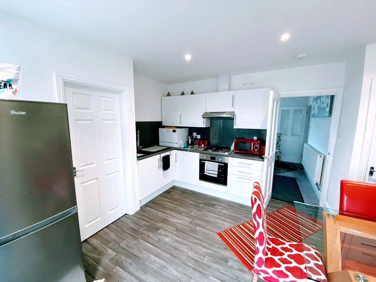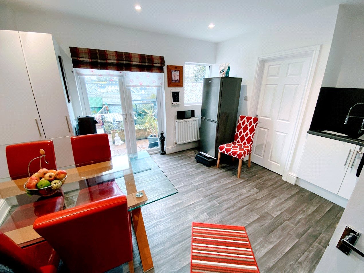 Vinyl flooring, modern base and wall units, gas hob, electric fan oven with extractor fan and lighting over, sink with mixer/pull out hose tap, spot lighting, understairs storage, uPVC double glazed window and french doors to rear, radiator, access to: