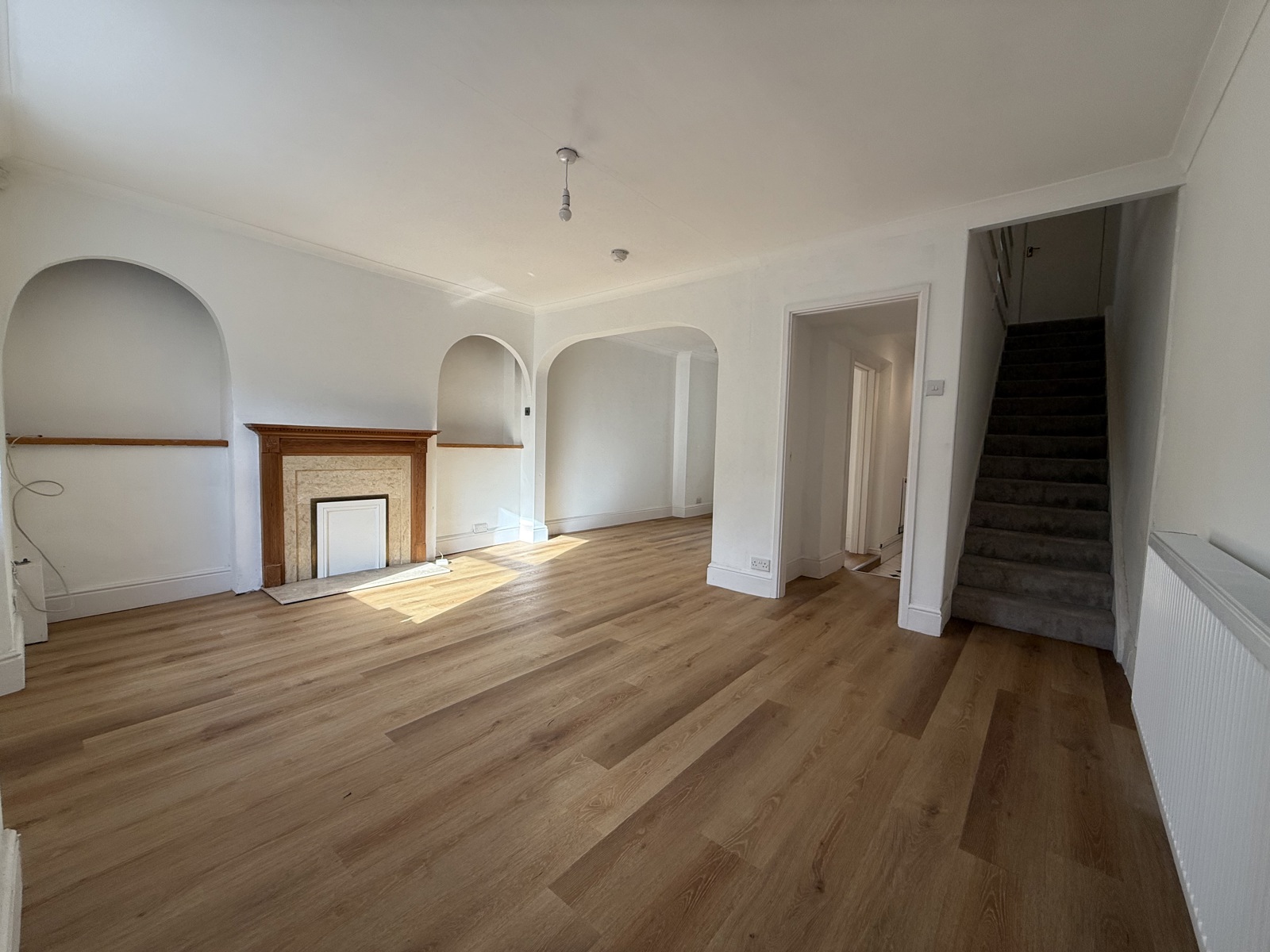 LVT wood effect flooring. Two decorative alcoves. Feature fireplace with wood surround and marble hearth. Ceiling light. Radiator. Staircase leading to first floor with a new fitted carpet.