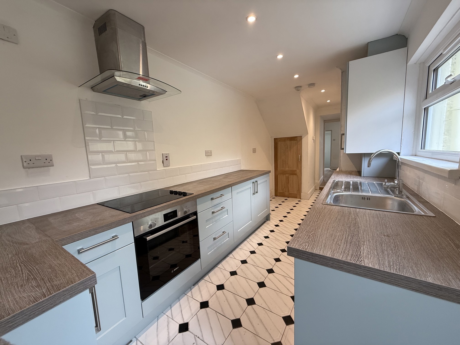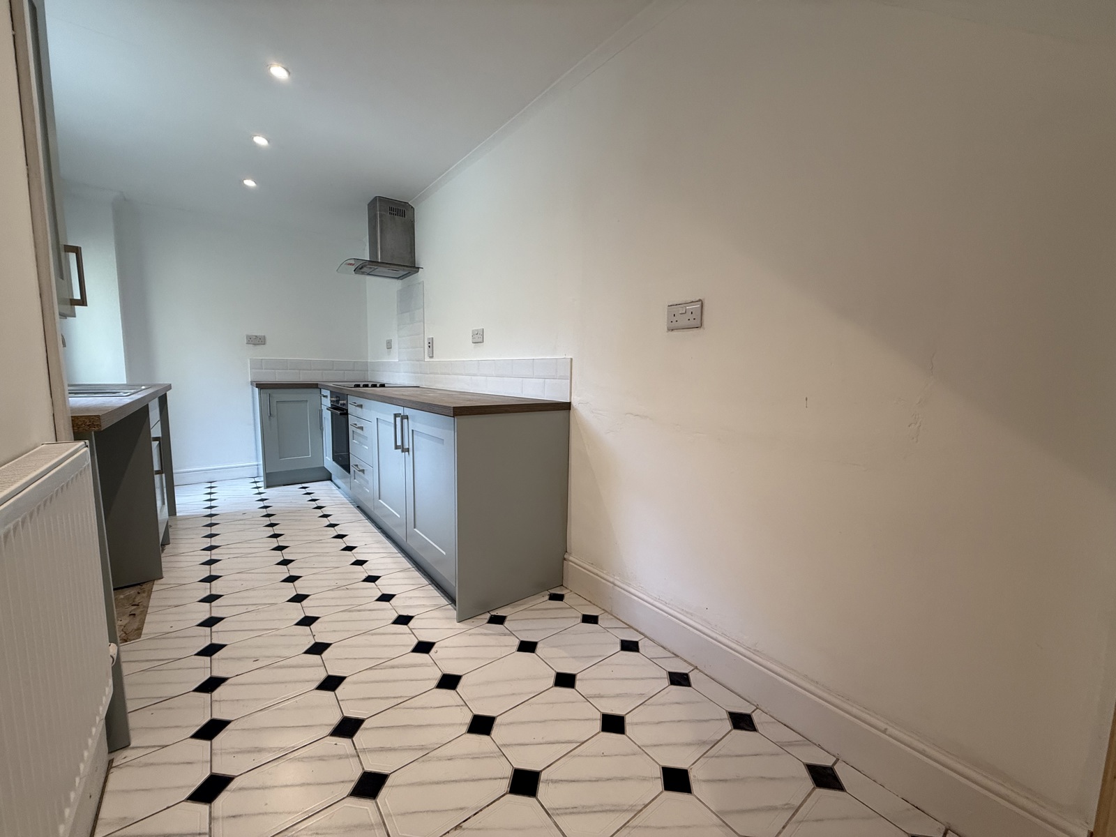Brand new shaker style fitted kitchen in duck egg blue with wood effect worktops. Integrated Electric hob & Bosch oven. Chrome extractor hood. Ample space for appliances. White tile splashbacks with stainless steel sink with Drainer. Up to date Worchester boiler situated within a matching Shaker style unit. Understairs storage cupboard. Ceramic tile floor. Radiator. Downlighters. Hard wired smoke detection system. UPVC double glazed window and external door leading to courtyard.