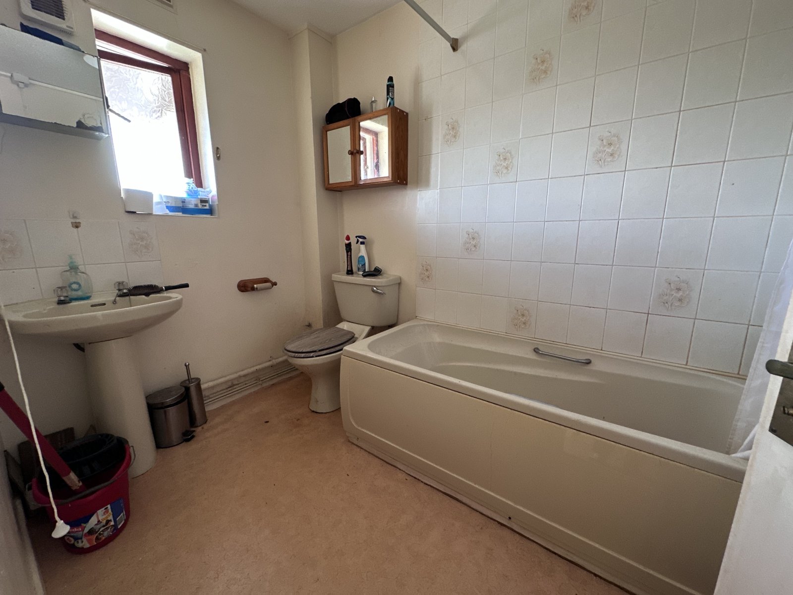 Laminate flooring, WC, bath with shower over, twin tap wash hand basin, tiled walls over bath/shower, central ceiling light, obscured uPVC double glazed window to fore.