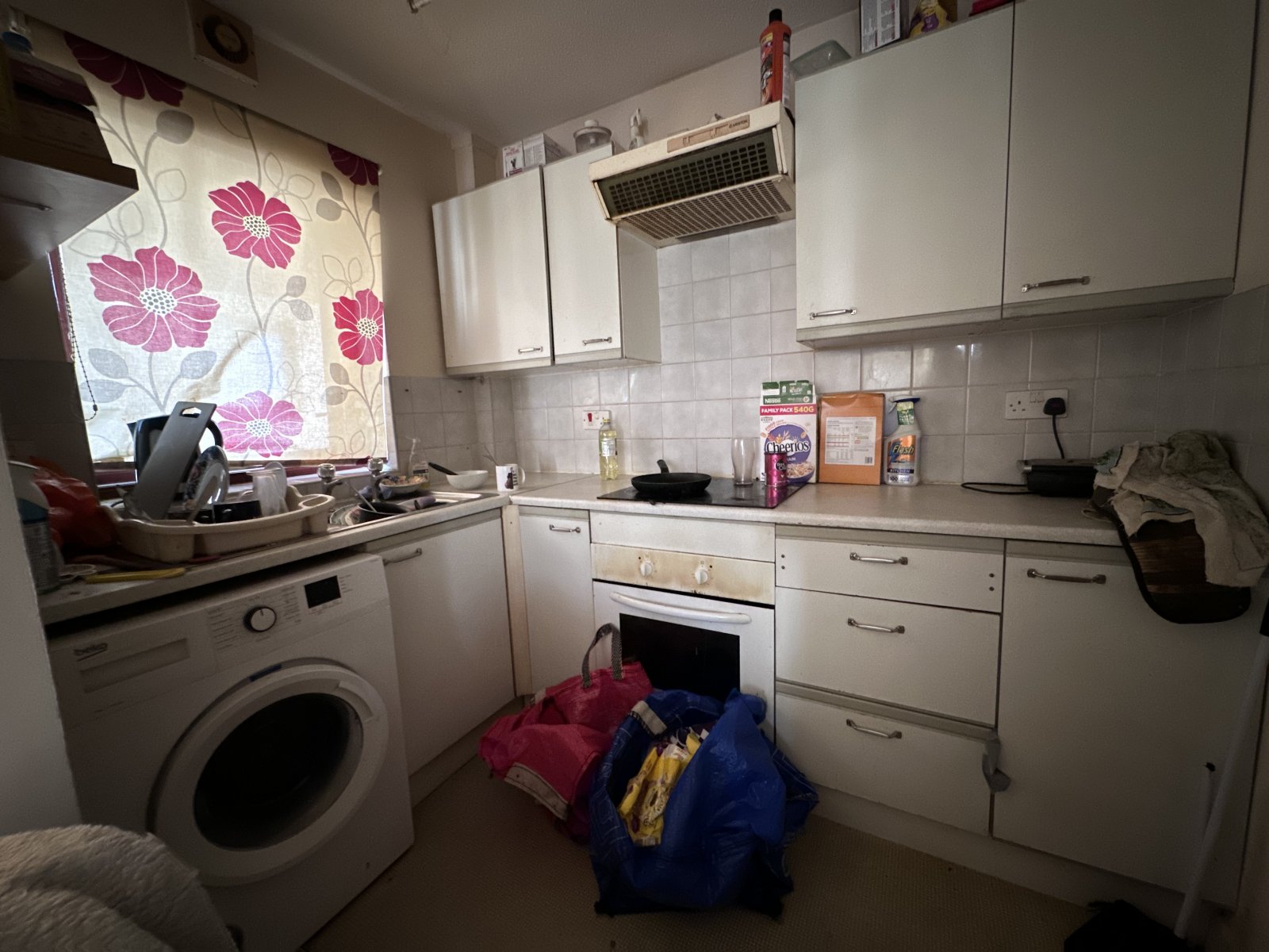 Laminate flooring, wall and base units, dual tap sink, electric cooker, tiled walls, central ceiling light, uPVC double glazed window to side .
