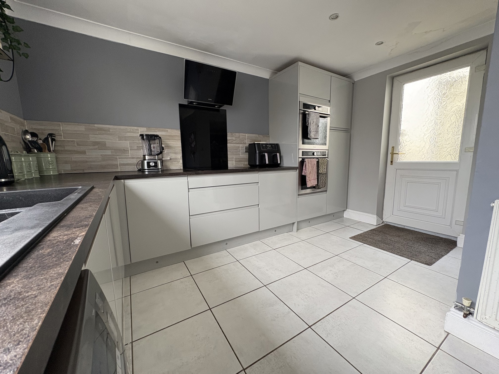 A modern kitchen with tiled flooring and splashbacks, featuring a range of base and eye-level units with sleek handleless cabinets, a sink and drainer, space for white goods, and integrated appliances. The room also includes a radiator, a double-glazed uPVC window and door to the rear, and provides access to the dining room.