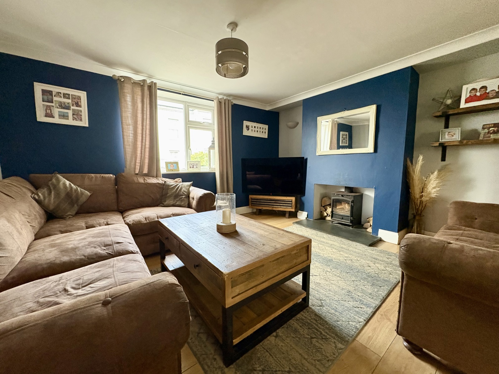 Spacious lounge featuring laminate flooring and a log burner set on a slate hearth. Also features two double-glazed uPVC windows and a radiator. Offers access to the entrance hall and dining room.