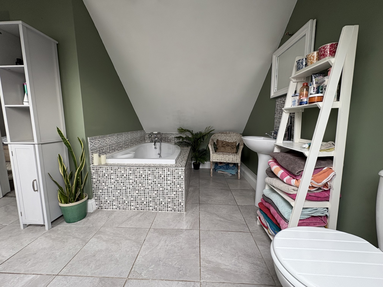 En-suite featuring tiled flooring, a wash hand basin, WC, and bathtub, with two Velux windows providing natural light.