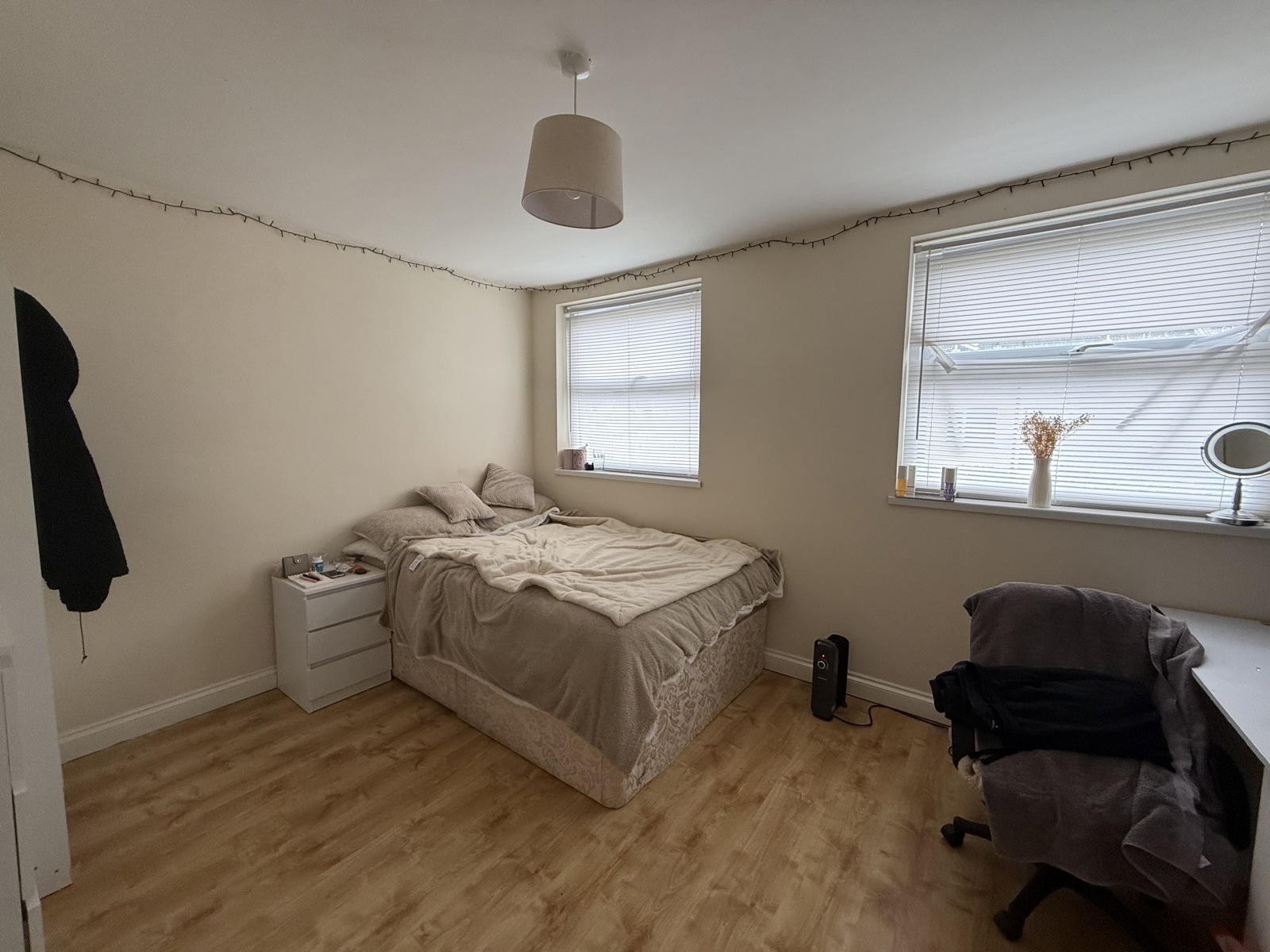 his spacious master bedroom offers a bright and welcoming setting, enhanced by twin windows that allow plenty of natural light. The room features a clean, modern finish with wood flooring and a wellproportioned layout that easily accommodates larger furniture. A central ceiling light and neutral décor create a calm, comfortable atmosphere, while the generous floor space makes the room both practical and versatile