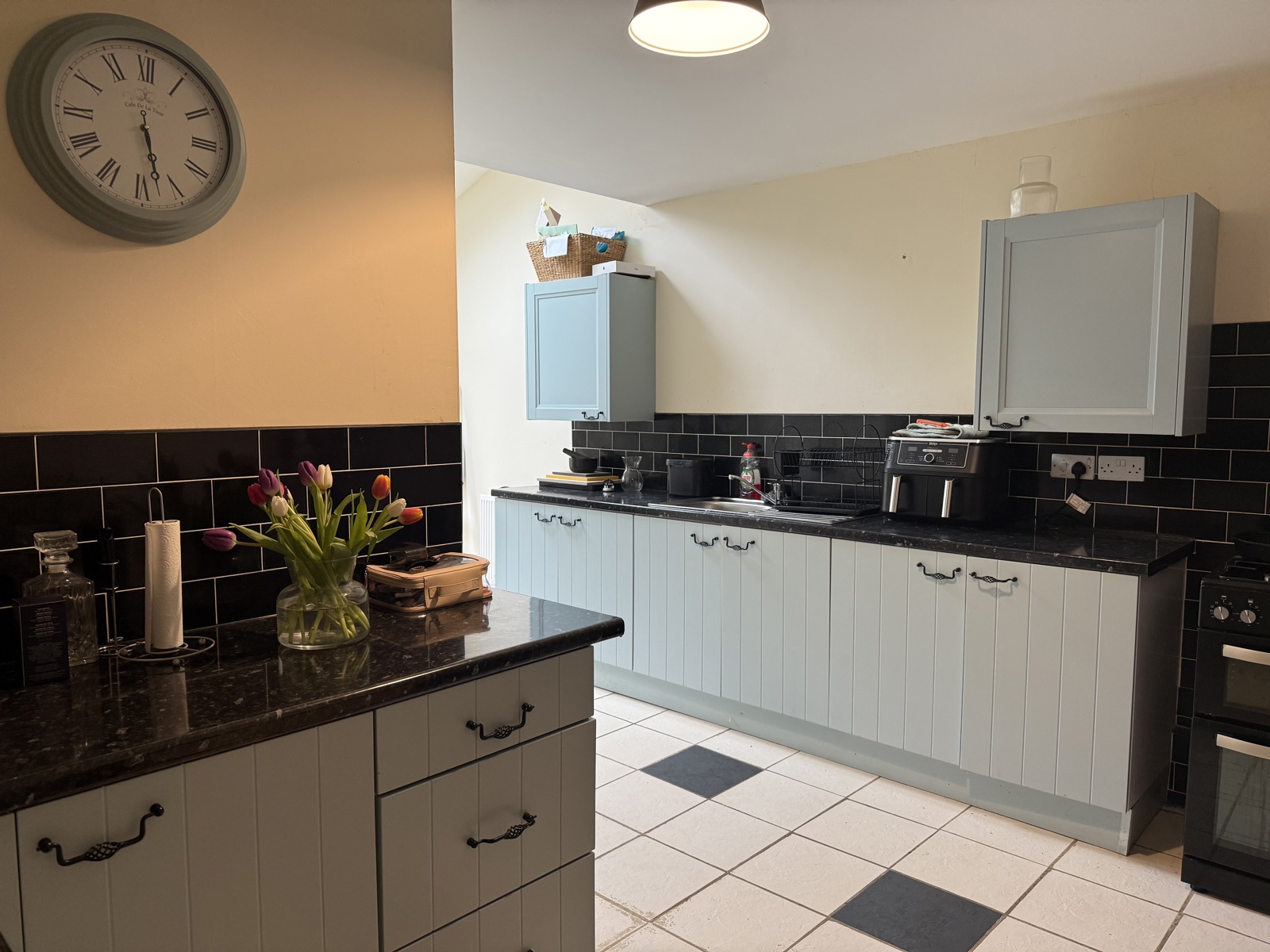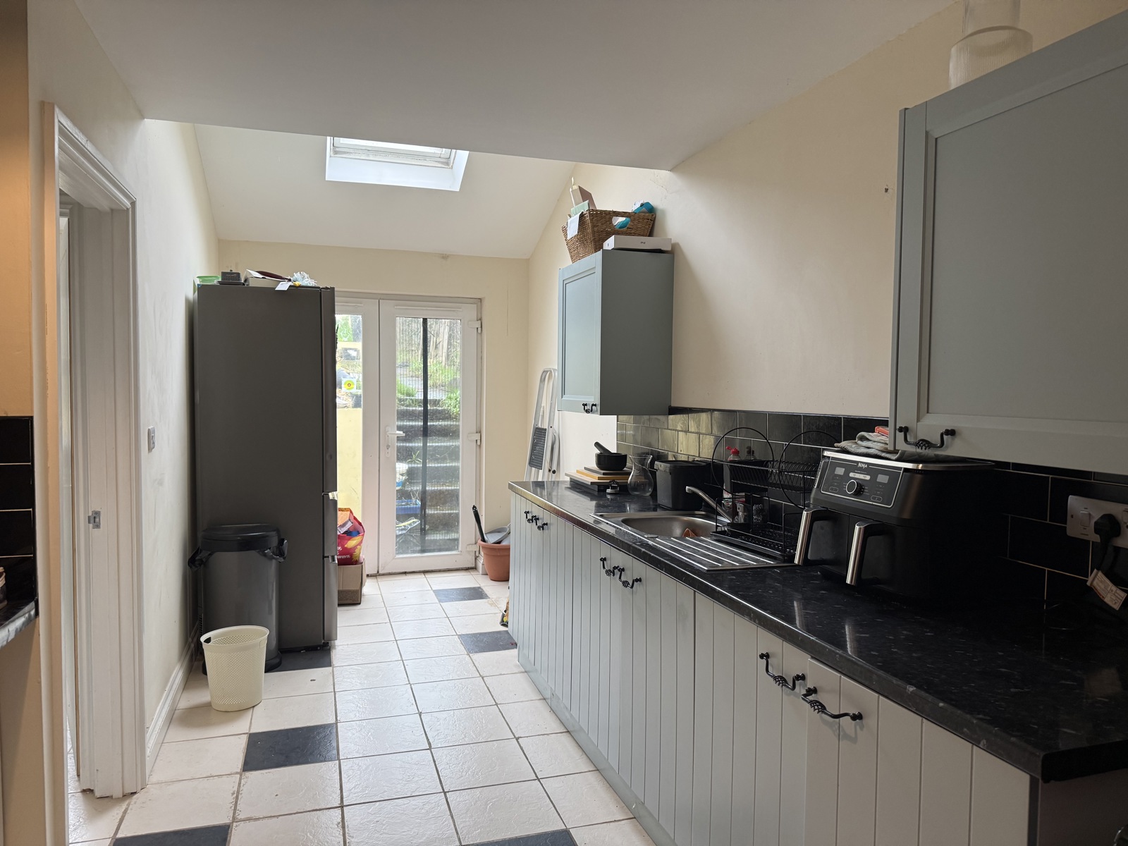 This modern kitchen offers a bright, well designed space with sleek cabinetry, glossy black worktops and a practical tiled floor. The long layout provides excellent storage and workspace, enhanced by natural light from the rear doors and overhead skylight. Stylish, functional and wellproportioned, it’s an ideal setting for everyday cooking and entertaining.
