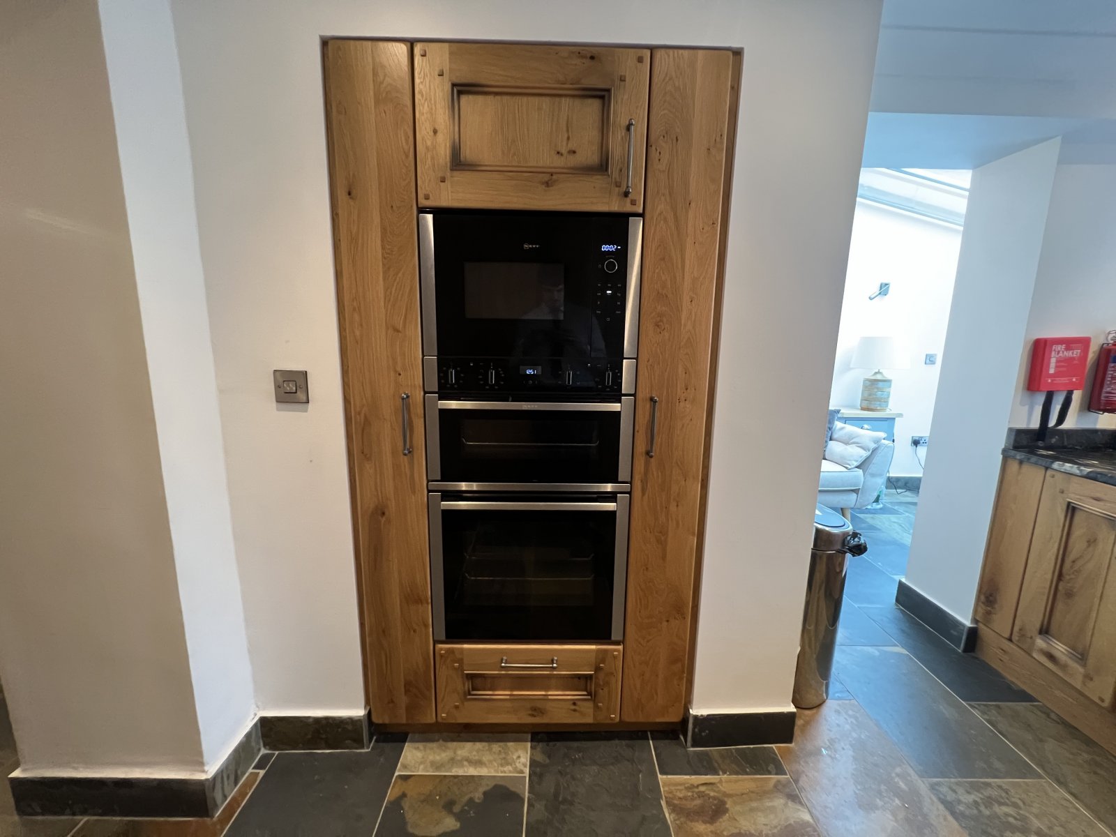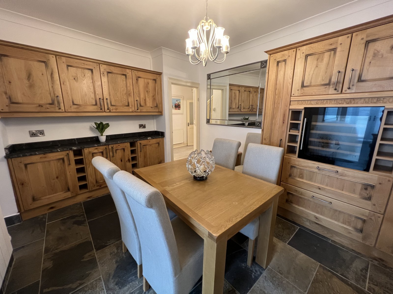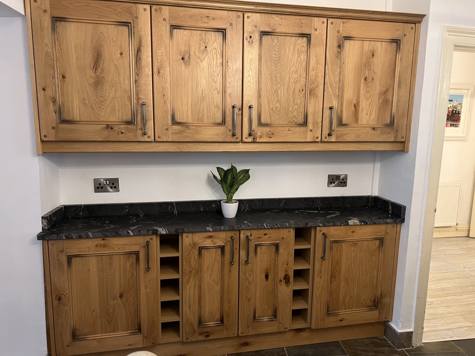 Pembrokeshire slate, black forest leather granite work tops, hand built oak base and wall units, fitted gas fire place, 3 x wall mounted radiator, fitted oven and grill, gas hob, mixer tap sink, uPVC double glazed window, spot lights, 2 x ceiling lights, uPVC double glazed patio doors, sun roof, wine cooler, cocktail cabinets.