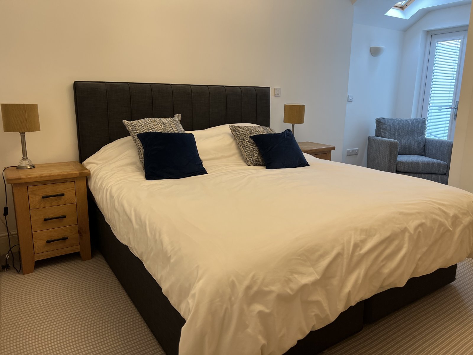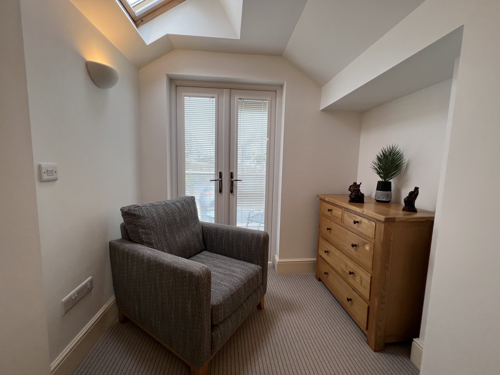 Carpet flooring, central ceiling light, 1 x wall mounted radiator, sky light window, uPVC double glazed patio doors leading onto balcony.