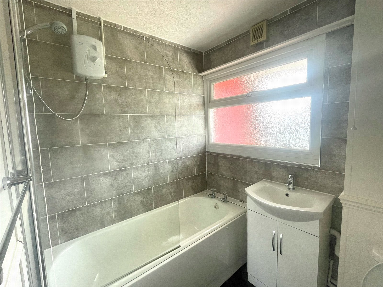 Vinyl flooring, newly enamelled bath with mixer taps, shower over bath, glass shower screen, wash hand basin in vanity unit with taps, WC, uPVC double glazed window with obscured glass, radiator.