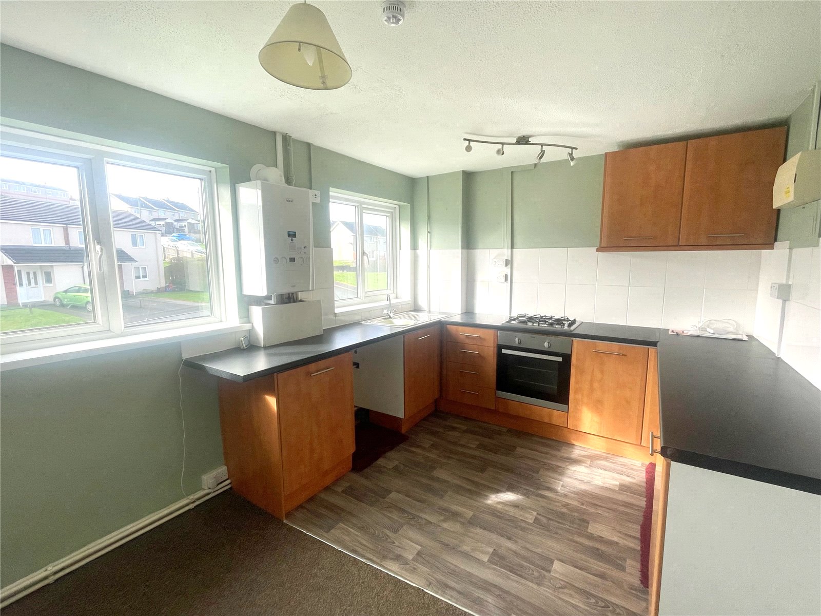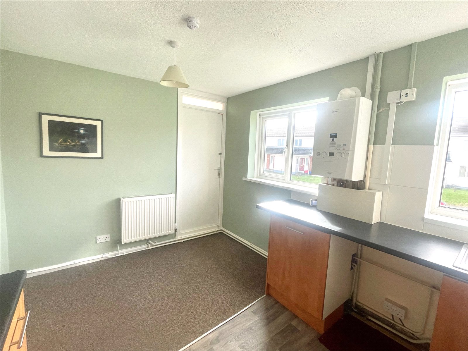 Laminate floor in kitchen with carpeted flooring in dining area, ceiling lights above both areas, a rang of base and wall units with an intergrated cooker and gas hob. Gas boiler fitted in 2022, 2 x uPVC double glazed windows, radiator, and access to balcony.